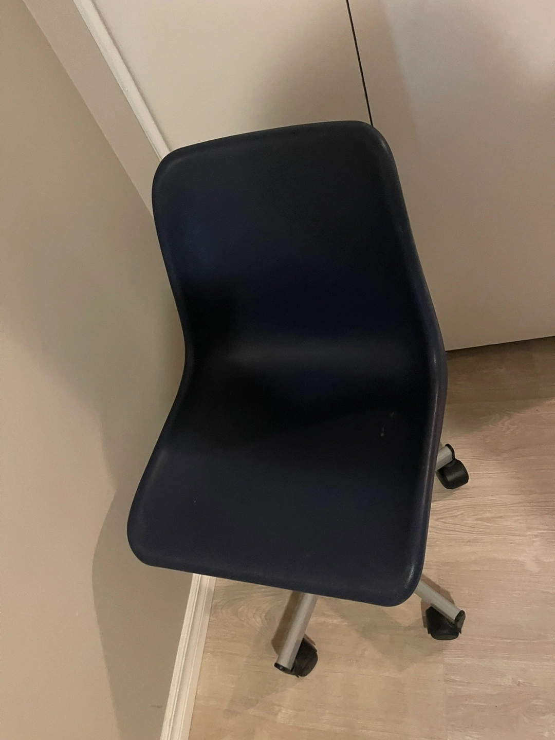 Selling a blue office chair in good condition. It's a simple and functional chair, perfect for a home office or study space and it rolls smoothly on its wheels.