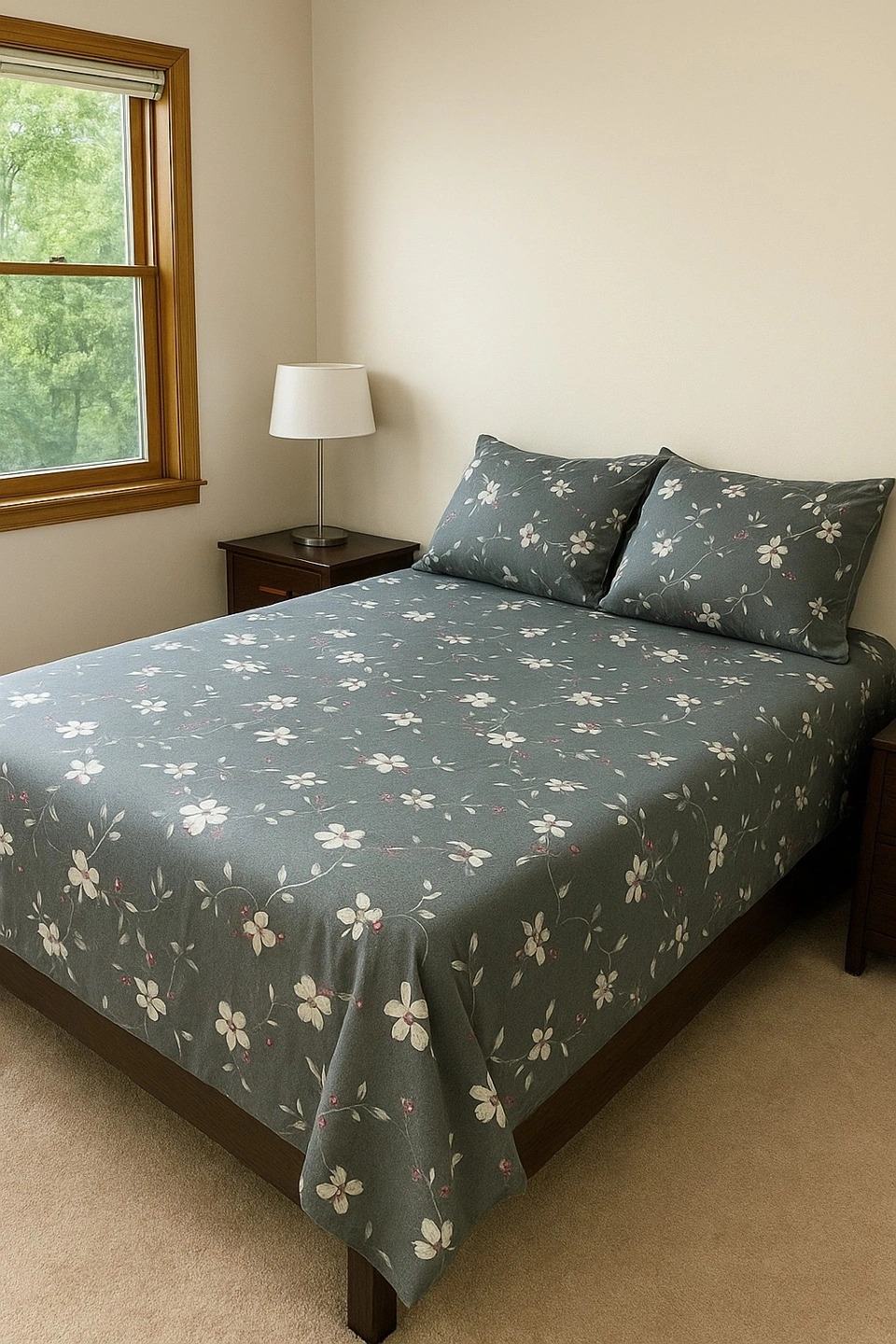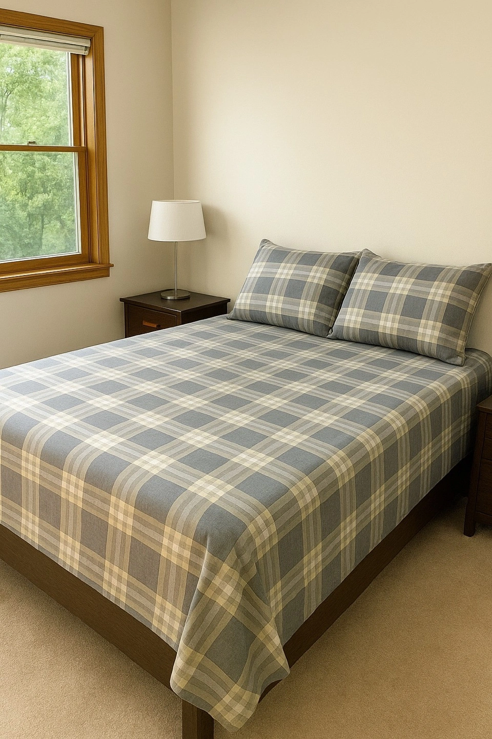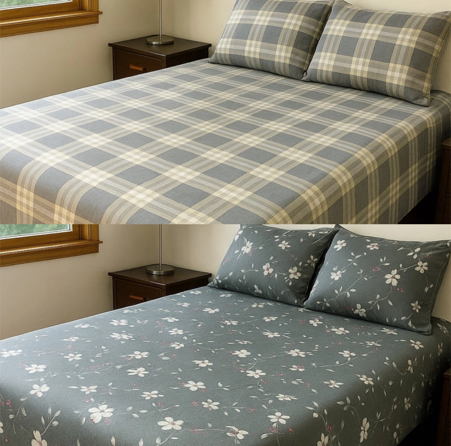 Here's a queen-size bed sheet set featuring two different patterns: a classic plaid and a pretty floral design! It include a flat sheet and two matching pillowcases. They are used just for 2 weeks in a smoke-free and pet-free home and ready to refresh your bedroom.