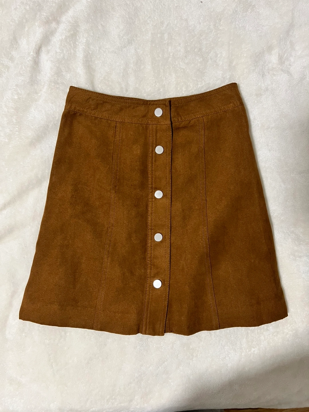 Selling a cute brown skirt from H&M's Divided line! It's a size 0 and features a button-down front. The material has a soft, suede-like feel. Perfect for adding a touch of retro style to your wardrobe!