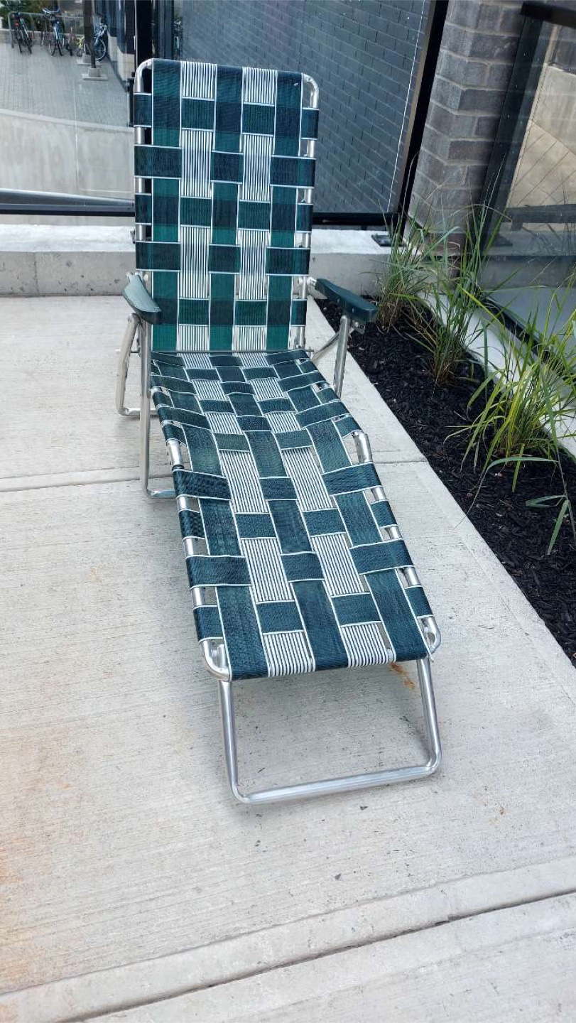 Selling a classic folding lawn chair with a green and white webbed design! It's perfect for relaxing in the backyard or taking to the park. The chair is in good condition and ready for a new home. It folds up easily for storage and transport!