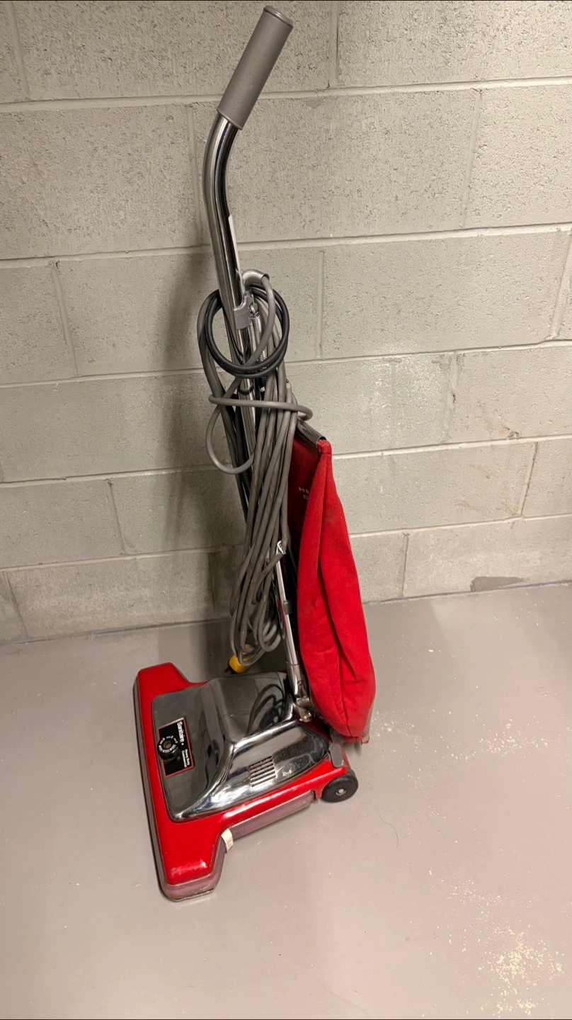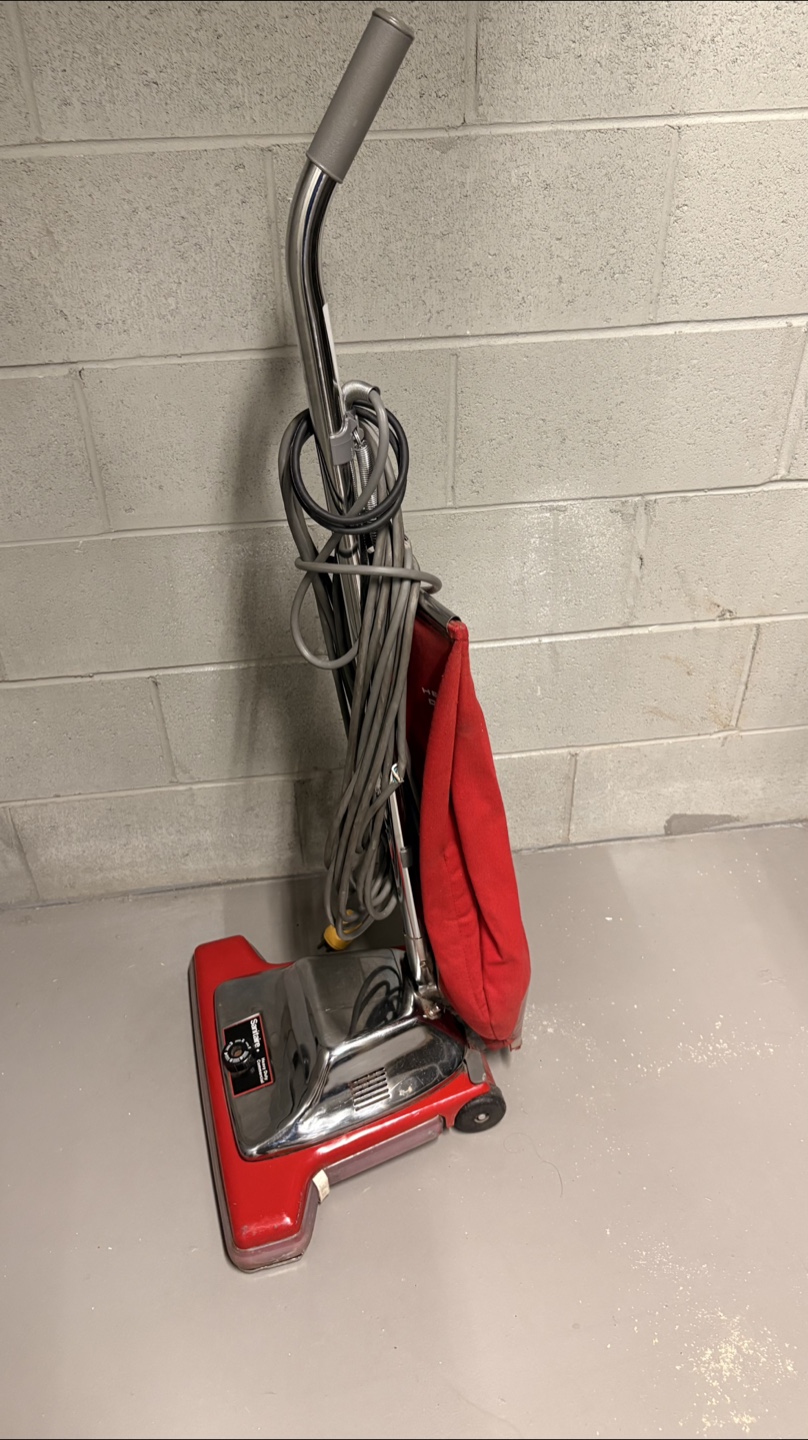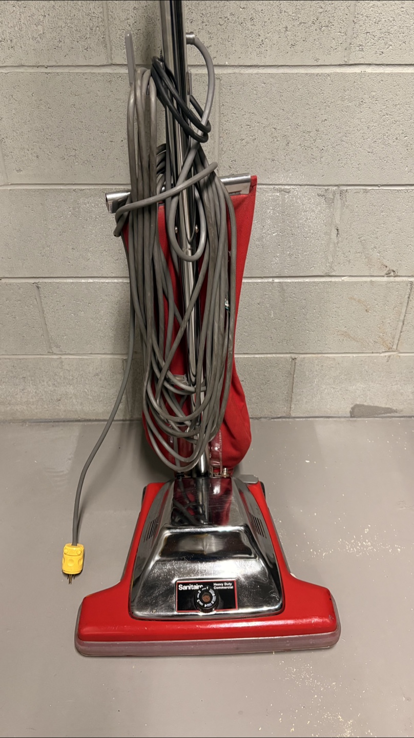 Selling a Sanitaire heavy-duty vacuum cleaner. It's red and silver and ready to go! Perfect for tough cleaning jobs around the house or workshop. It has a long cord for reaching those far corners