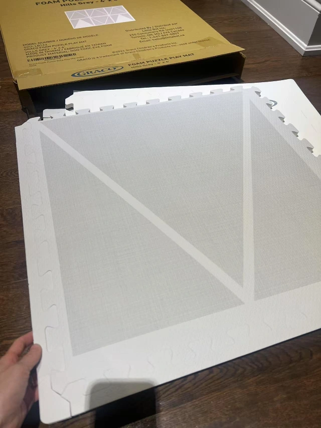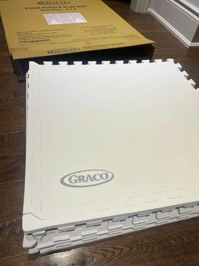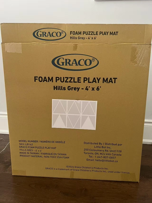 Graco Foam Puzzle Play Mat in Hills Grey, sized 4' x 6(120 x 180cm). It's made of non-toxic EVA foam and comes in its original box. Perfect for a safe and fun play area for your little one!