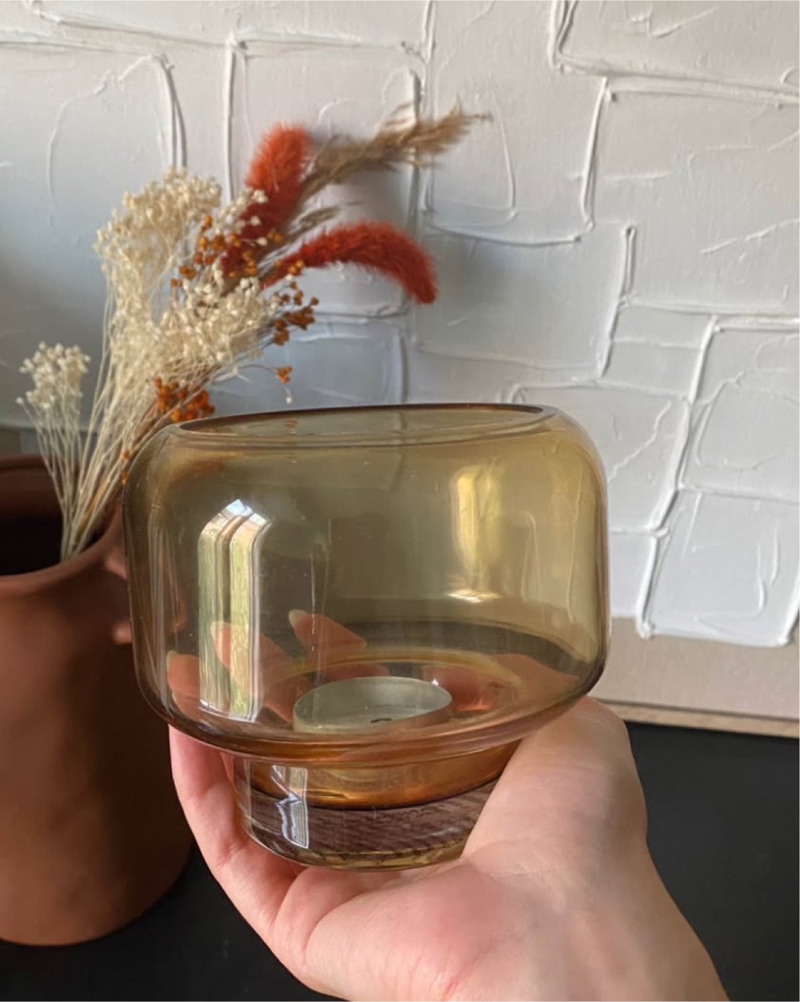 Here's a lovely amber glass candle holder that would look great in any room! It's in excellent condition and ready to bring a warm glow to your space