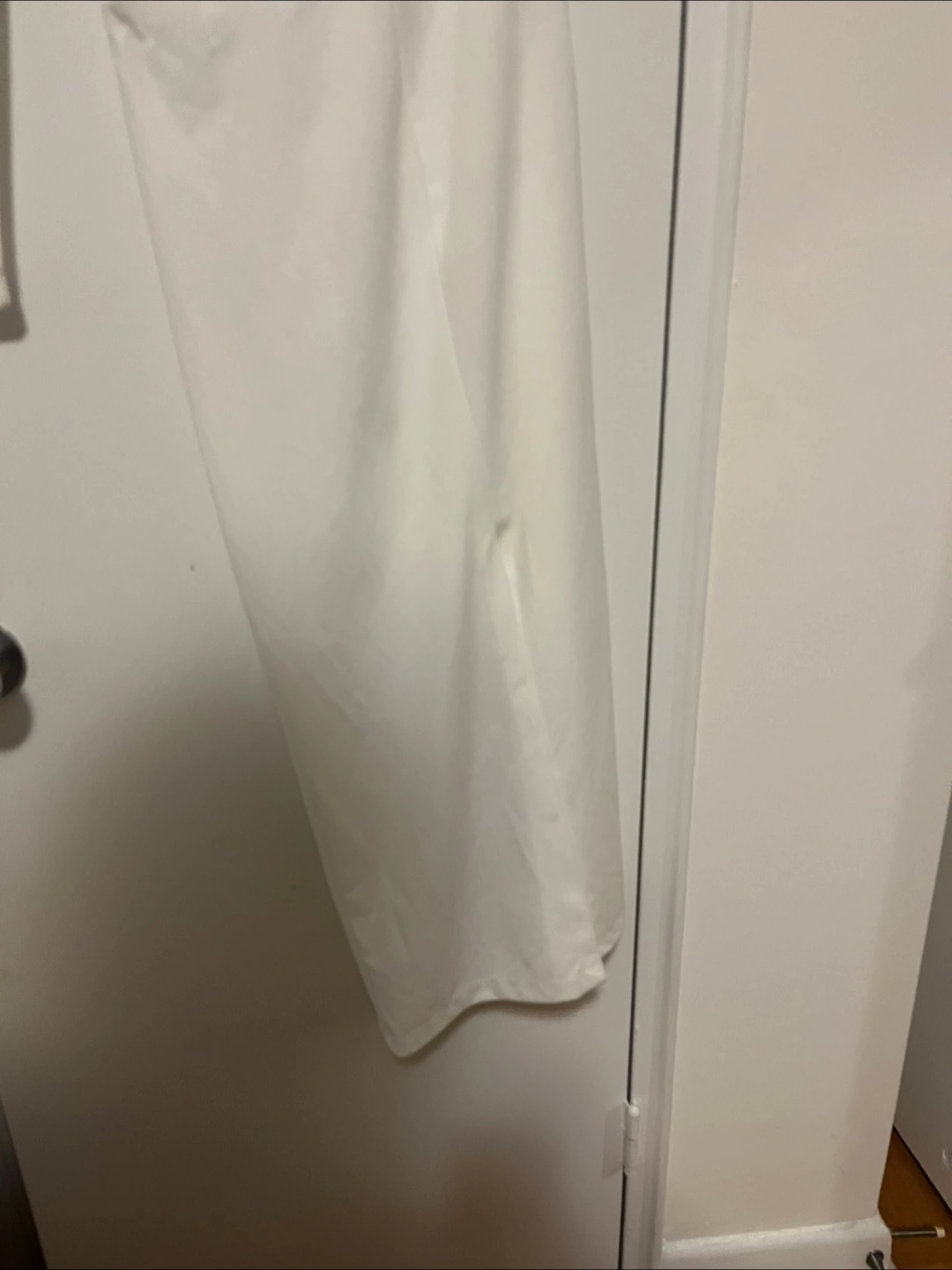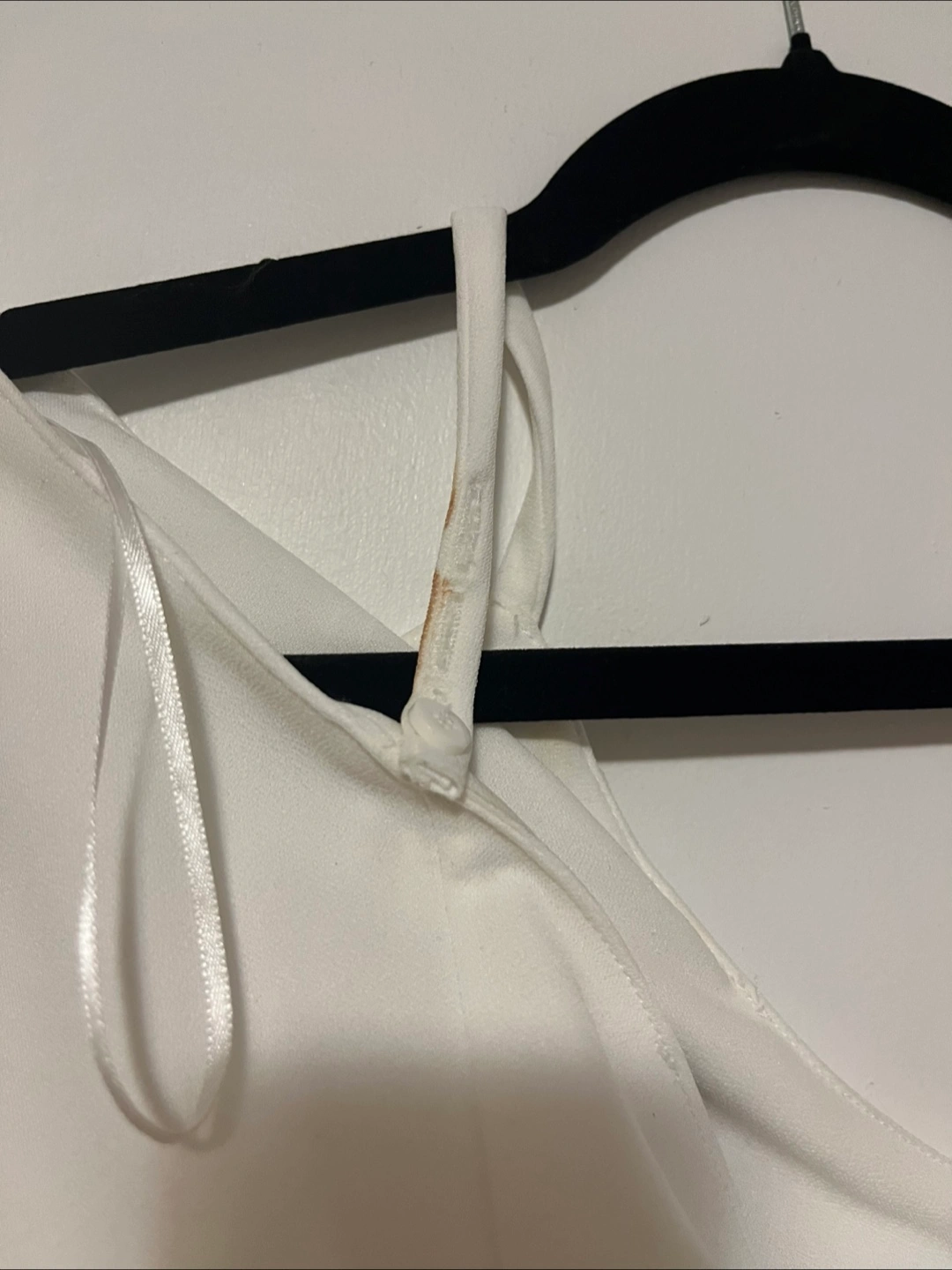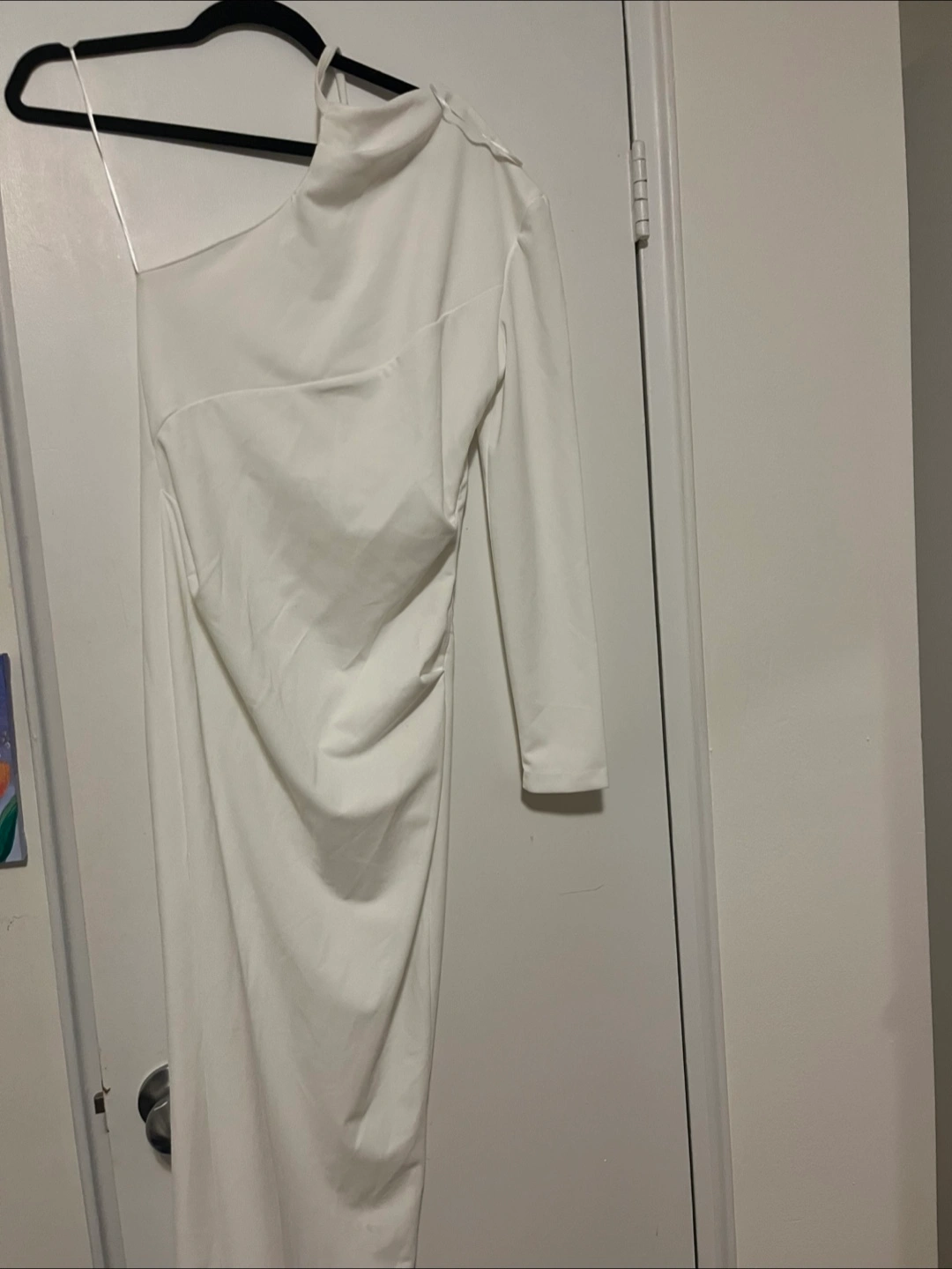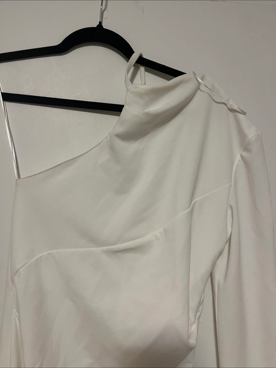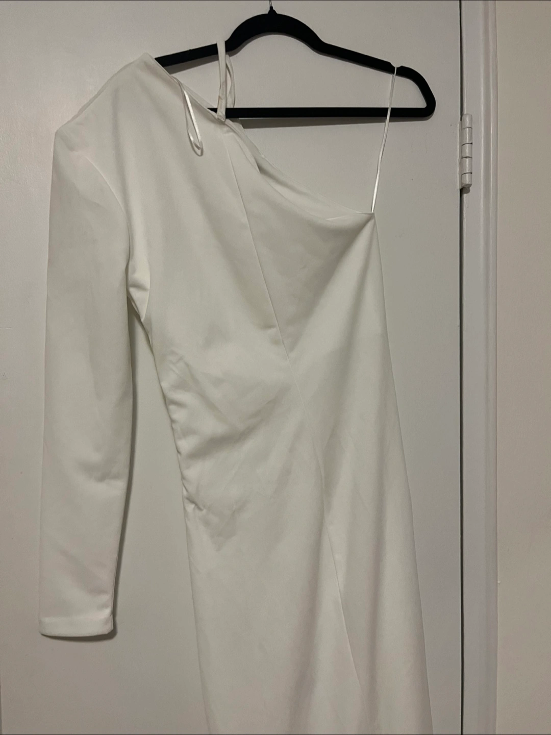 Selling a stylish white one-shoulder dress. It has some staining on the strap. Please see photos for details! Size medium but fits small