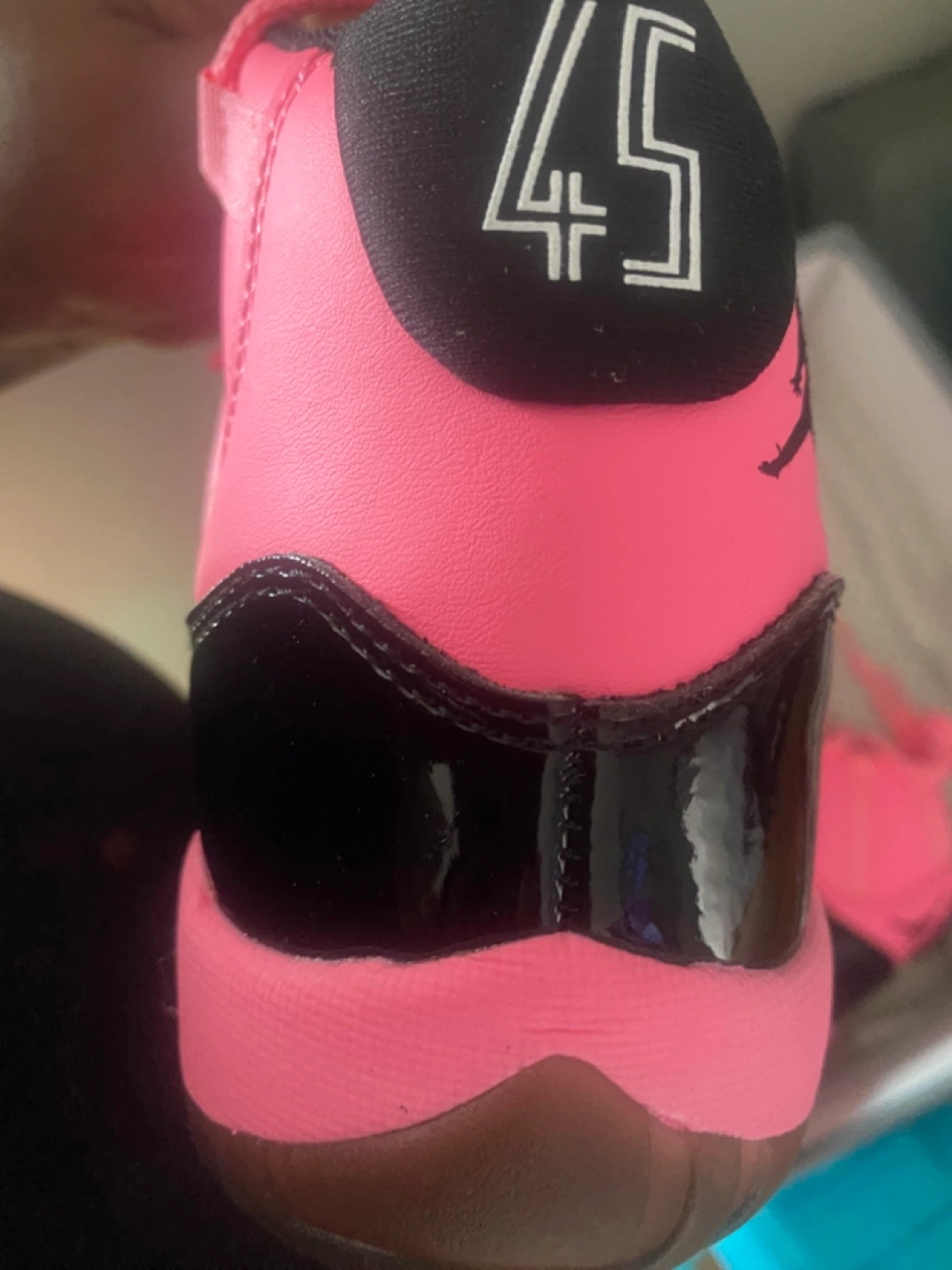Selling a pair of Jordan 11 Retro in pink and black, featuring the '45' detail. They are a size 7Y and come with the box