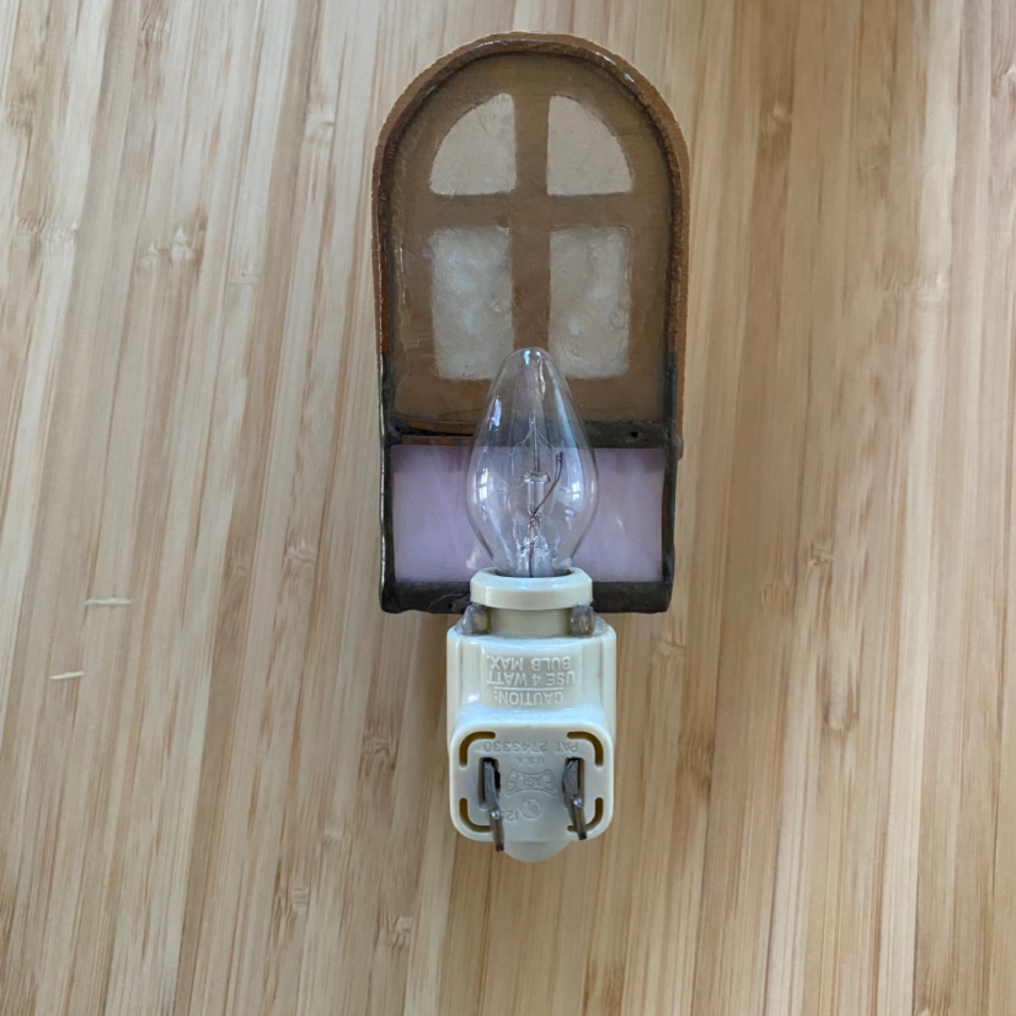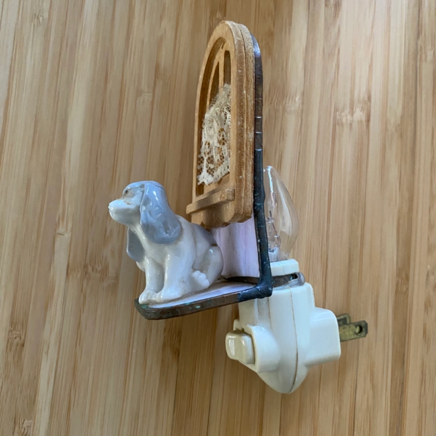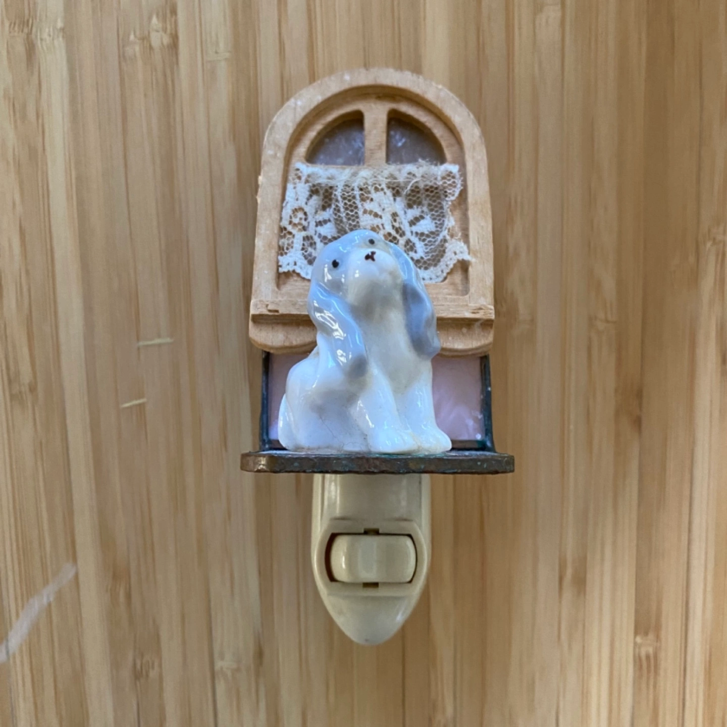 Here's a charming vintage night light featuring a sweet dog figure by a window! It's a unique piece that adds a cozy touch to any room. The night light is in good condition and ready to brighten up your space