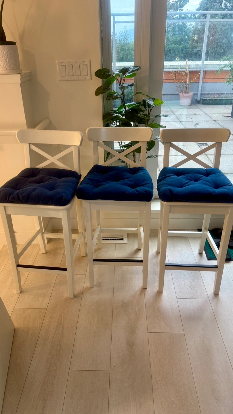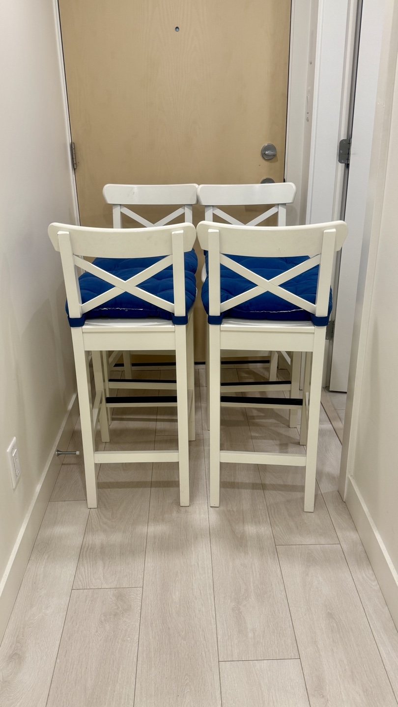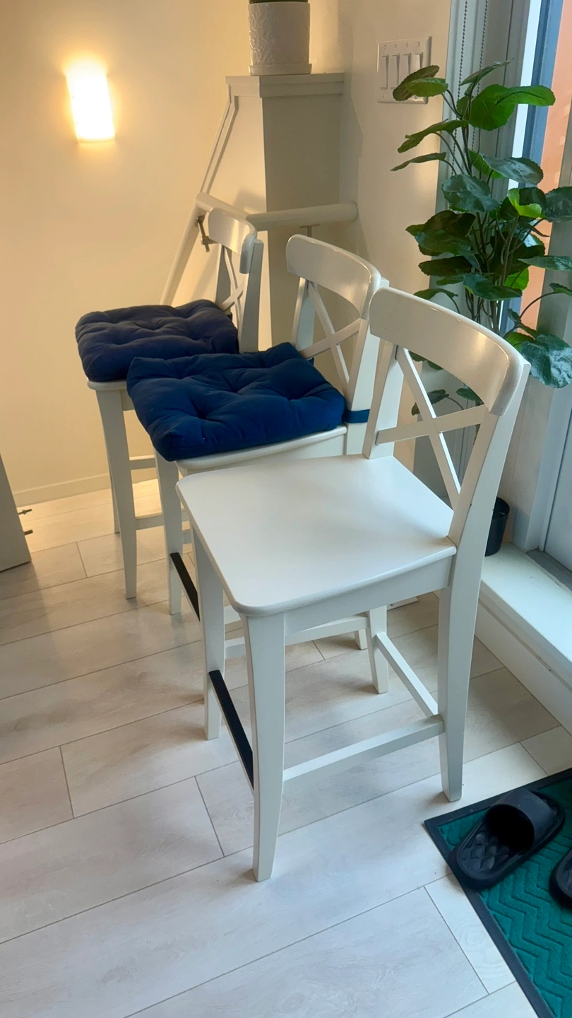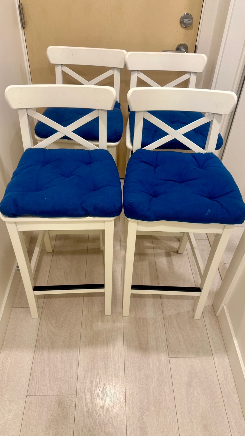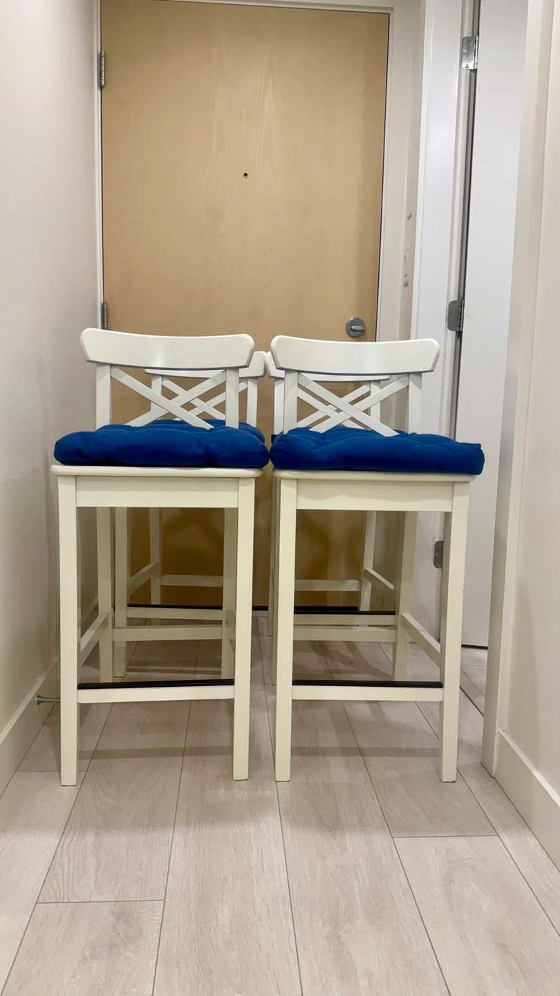 Selling a set of IKEA Ingolf bar stools! They're in great shape and come in a clean white finish. Each stool has a comfy blue cushion, perfect for adding a pop of colour to your kitchen or bar area. Sturdy and stylish, these stools are ready for a new home