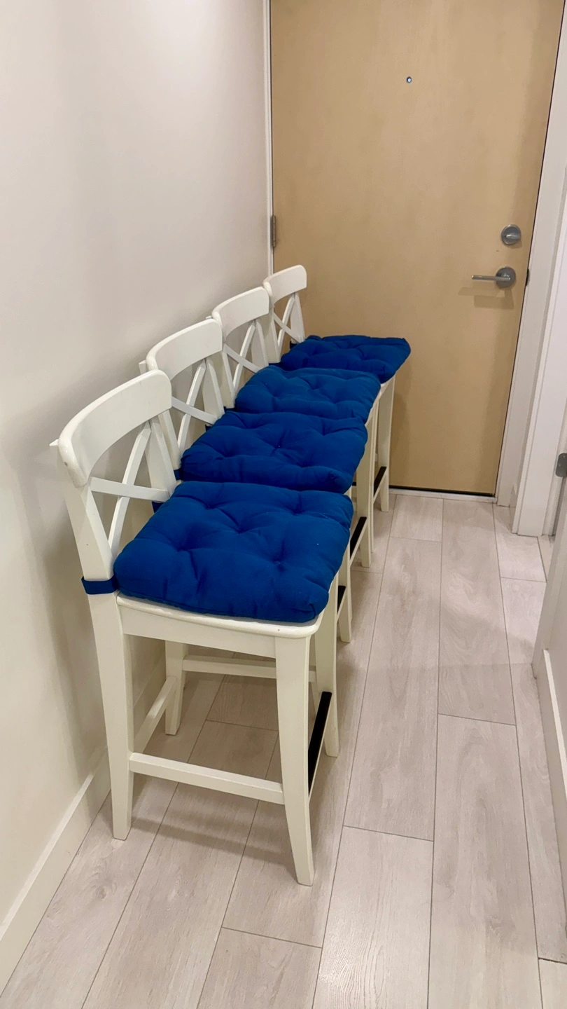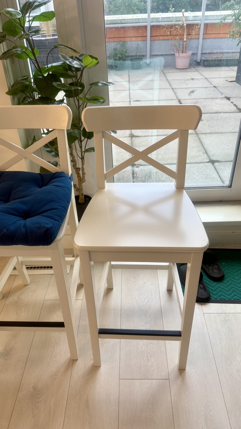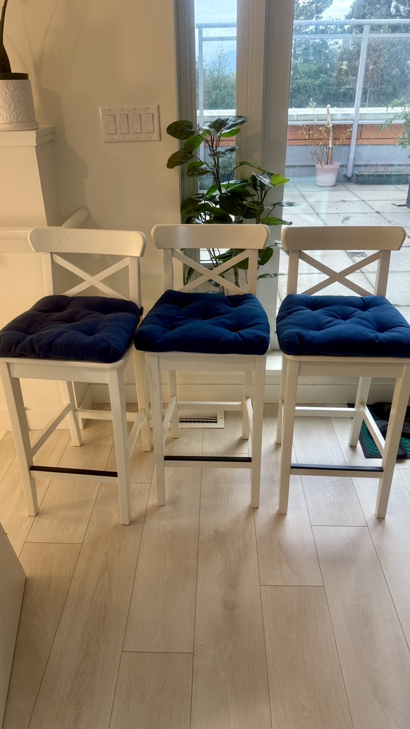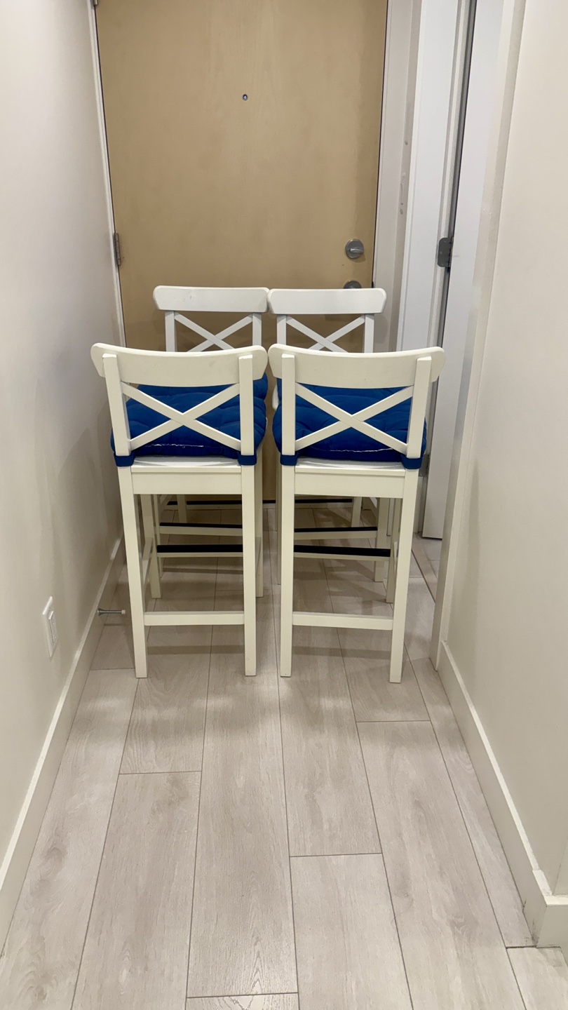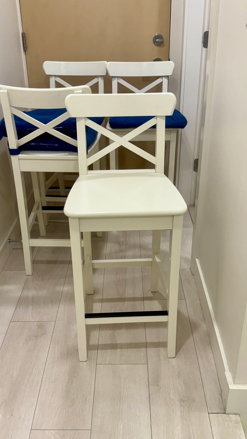 Selling a set of IKEA Ingolf bar stools! They're in great shape and come in a clean white finish. Each stool has a comfy blue cushion, perfect for adding a pop of colour to your kitchen or bar area. Sturdy and stylish, these stools are ready for a new home