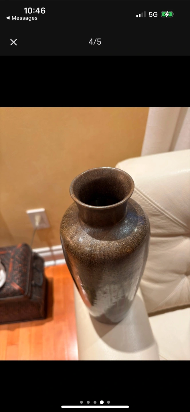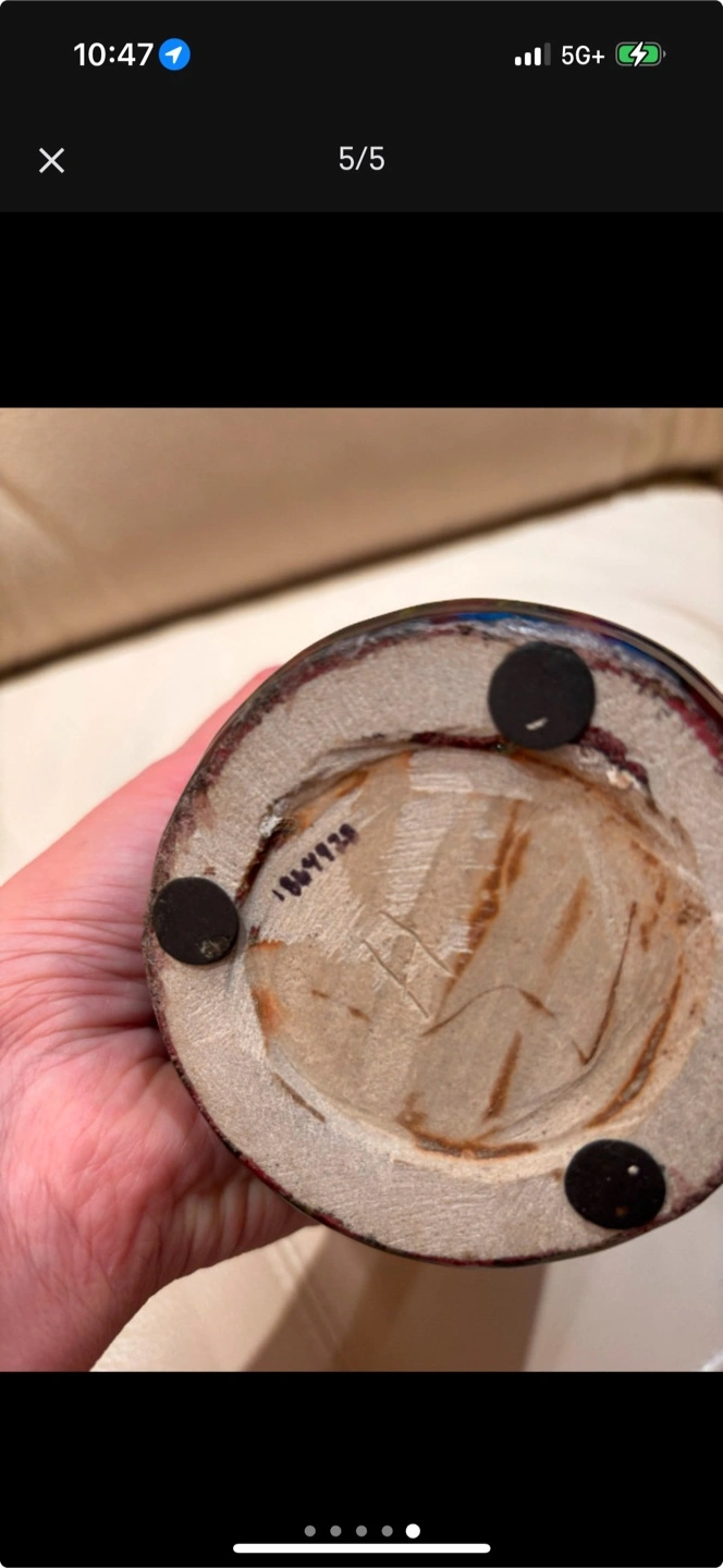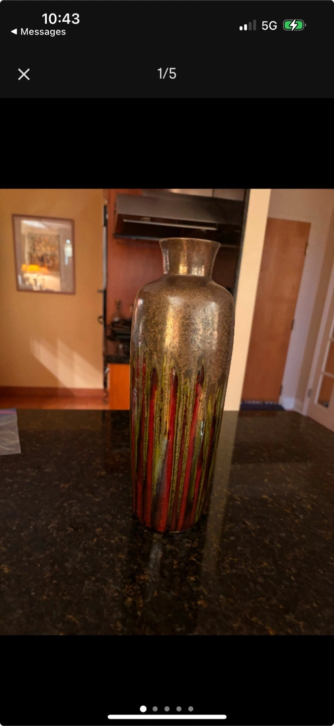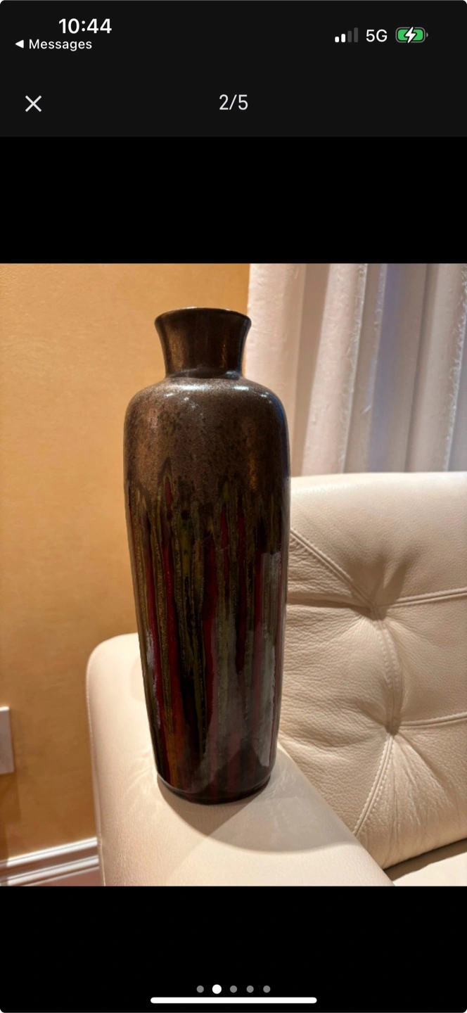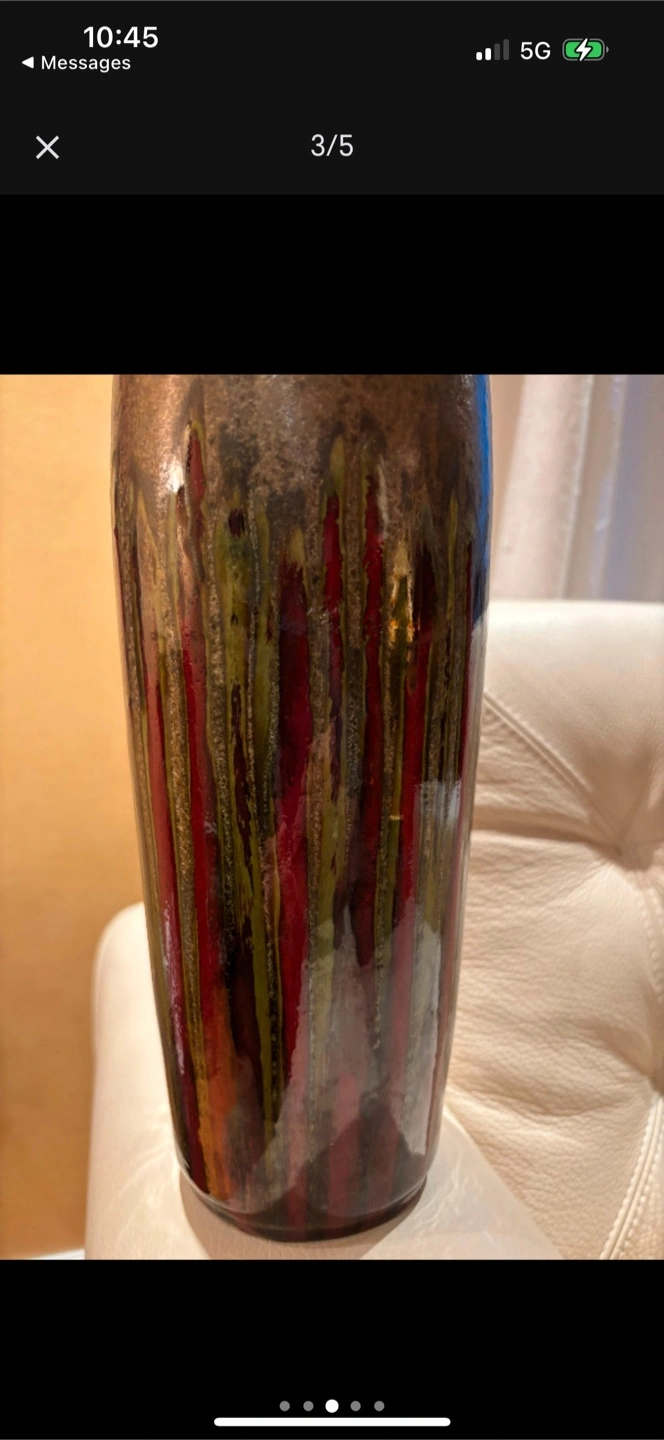 This is a beautiful vintage decorative vase with a unique drip glaze design that is numbered at the bottom. The colours are a mix of brown and red, giving it a warm and earthy feel. It is 13 inches tall and 2 1/2 inches wide.