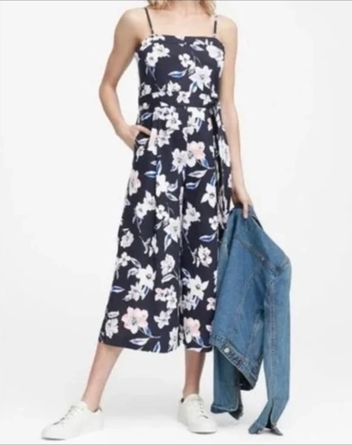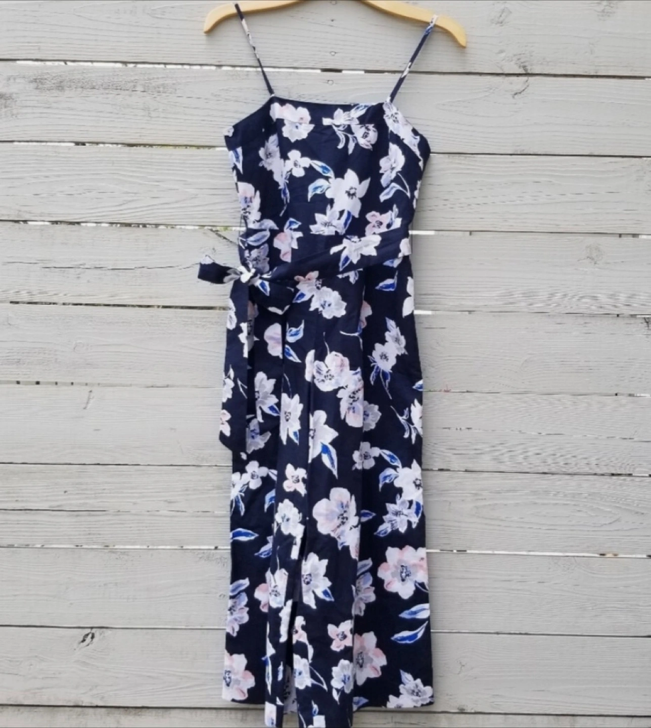 Beautiful floral print. Soft cotton material, adjustable straps, hidden zipper closure in back, pockets and a tie belt.