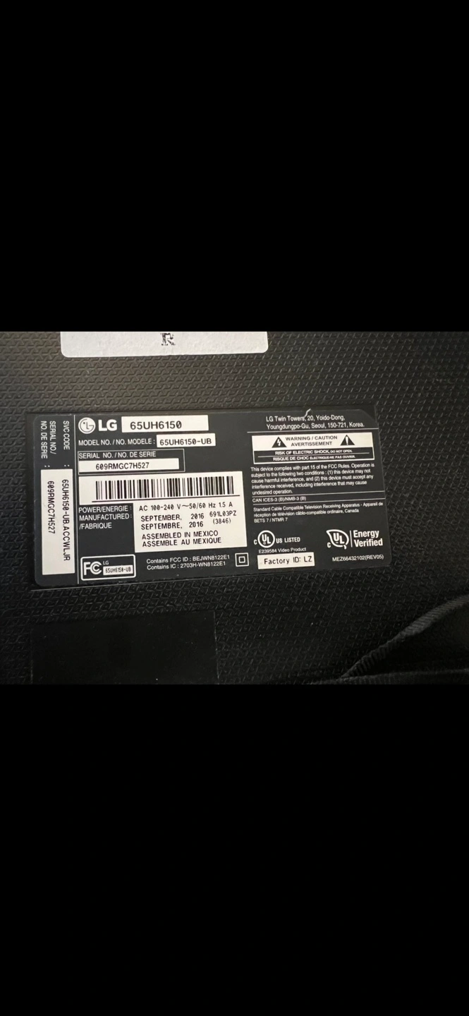 Selling my used perfect working no scratches or damage LG 65 inch 4K Ultra HD Smart LED TV, model UH6150 with workable remote, in great condition. This TV delivers stunning visuals with its 4K resolution and vibrant colours, perfect for movies, gaming, and streaming your favourite content. It comes with webOS 3.0 for a smooth smart TV experience. TV was used with a wall mount. Sorry but can’t find and maybe possibly throughout the legs. However there is a new TV Wall mount included with this TV