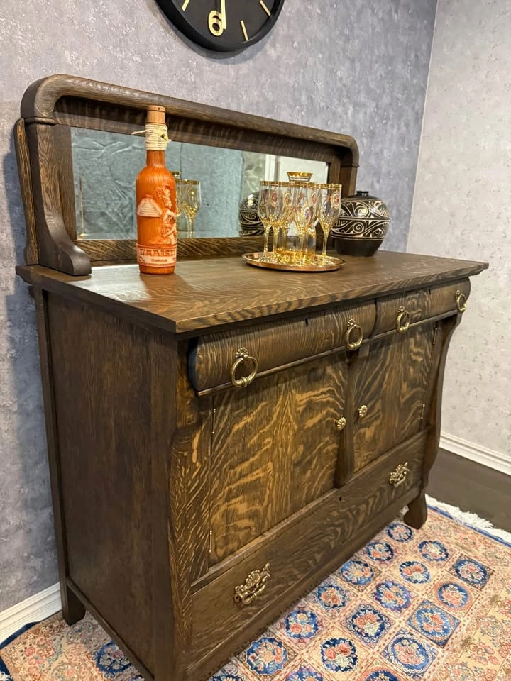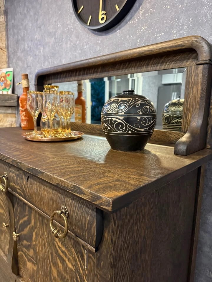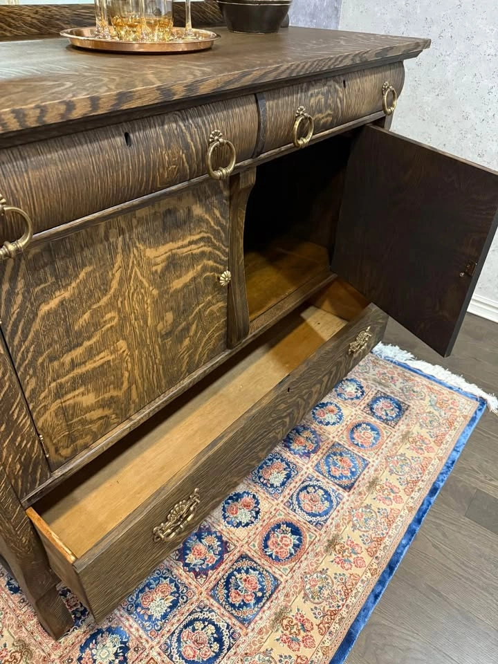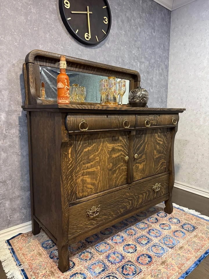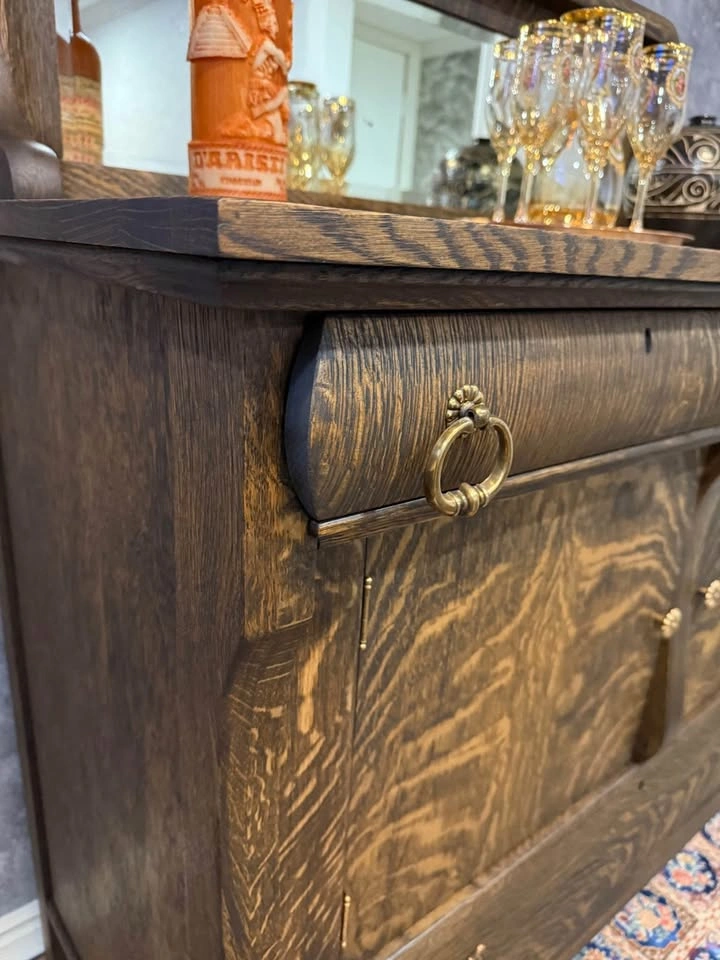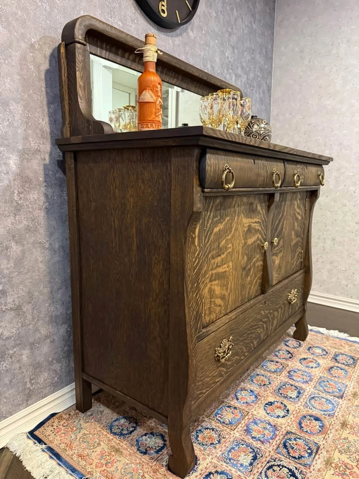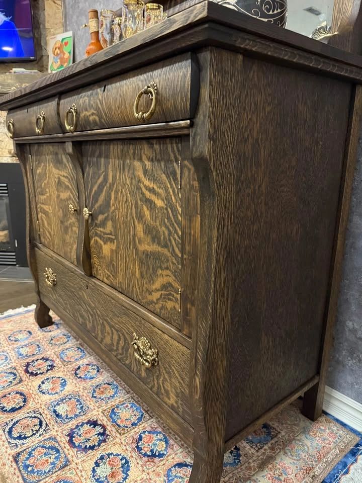 This is a true vintage sideboard from the early 1900s, crafted in stunning quarter sawn Tiger Oak – known for its unique “tiger stripe” grain. • Over 100 years old, yet fully restored and ready for everyday use • Solid oak construction (no veneer) – stable, strong, no wobble • Smooth, well-fitted drawers and cabinets • Professionally refinished with a durable water-resistant finish • Gorgeous golden-brown patina with striking tiger oak grain • Original antique brass hardware in excellent condition Perfect as a buffet, bar cabinet, entryway statement piece, or dining room storage. This sideboard carries the elegance and craftsmanship of the early 20th century while being fully functional for modern living. 📏 Dimensions: 48Lx22Wx39H Inches ✅ 100+ years old – genuine vintage character ✅ Strong & stable – no structural issues ✅ Water-resistant finish for practical use Pickup in Thornhill