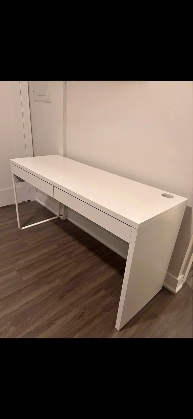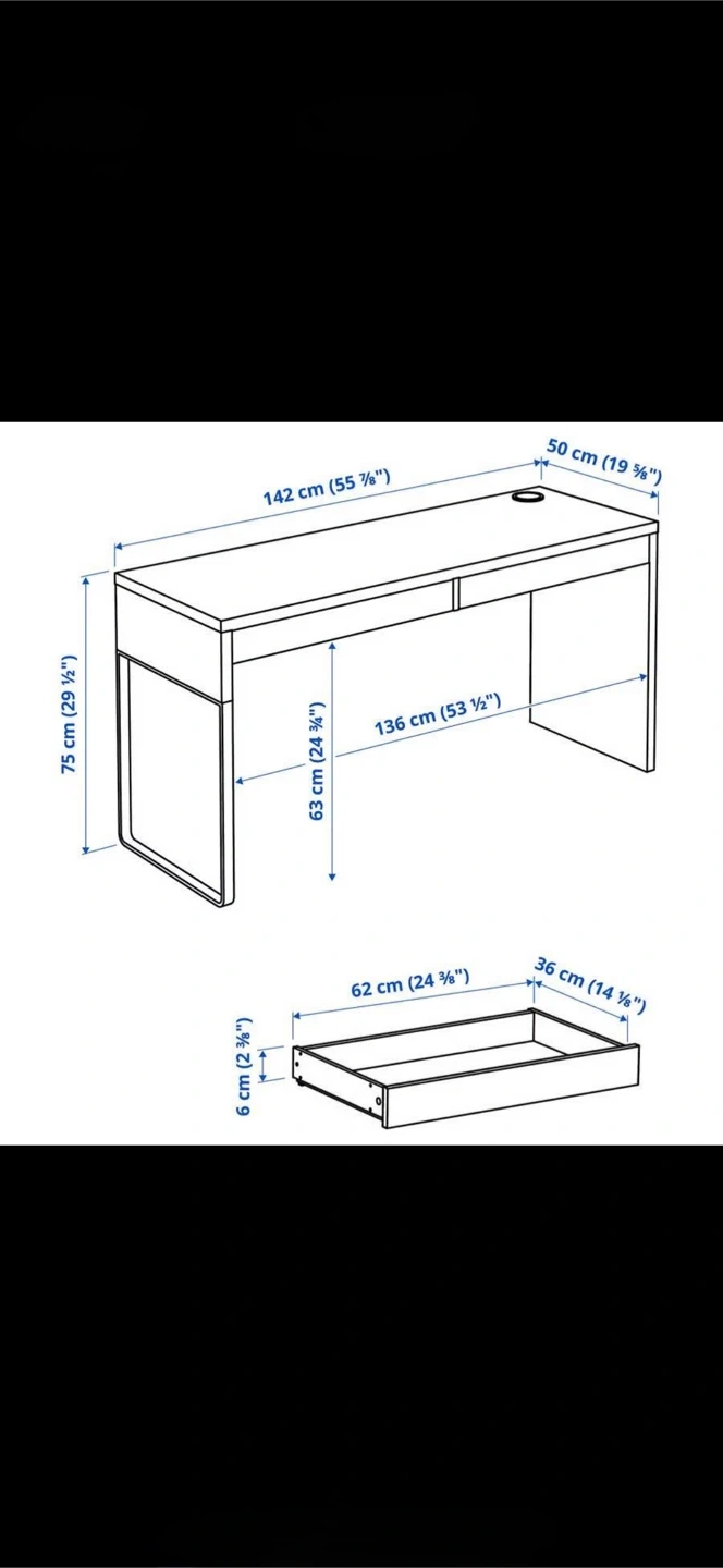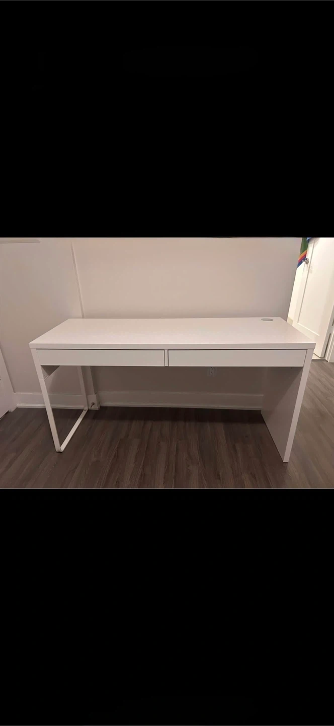 Selling a white IKEA desk in great condition. It features a clean and simple design with two drawers for storage. The desk is 142 cm (55 7/8") long, 75 cm (29 1/2") high, and 50 cm (19 5/8") wide. Perfect for a home office or study space!