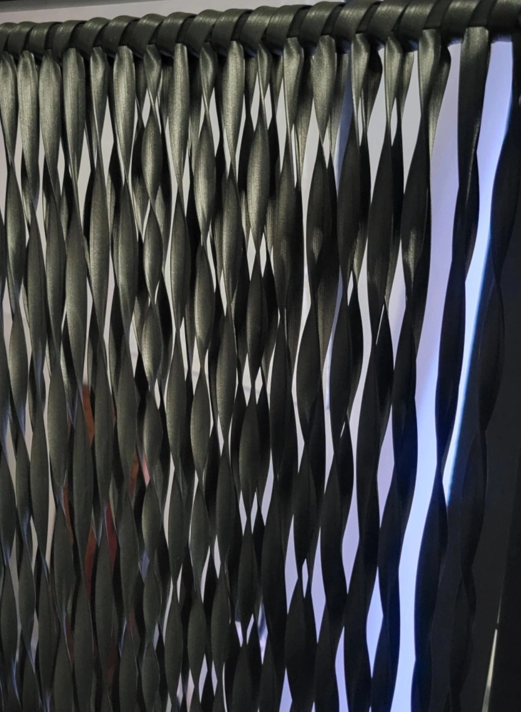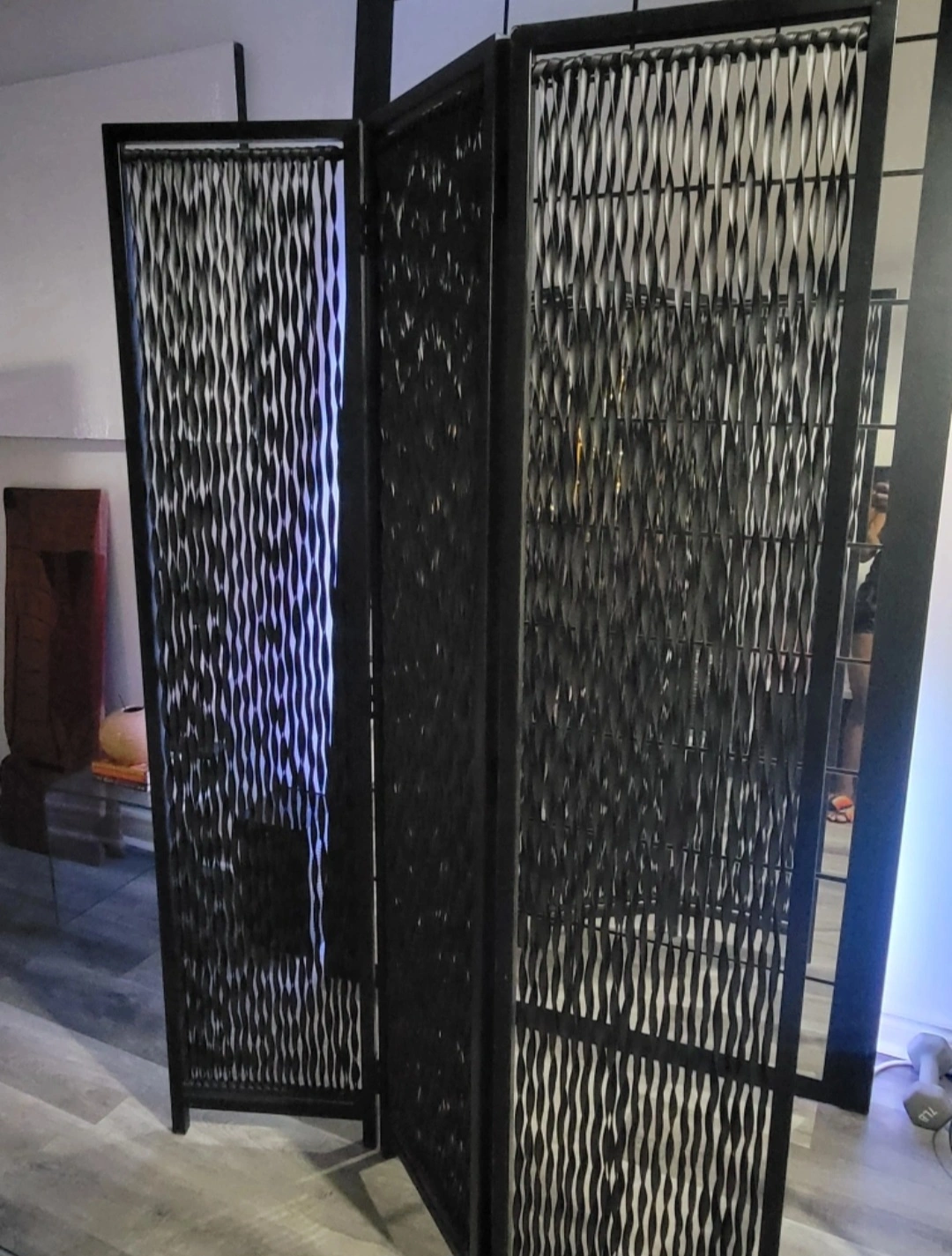 Selling a black metal and leather decorative room divider. It features a unique woven design. Perfect for adding privacy or style to any room in your home or apartment!