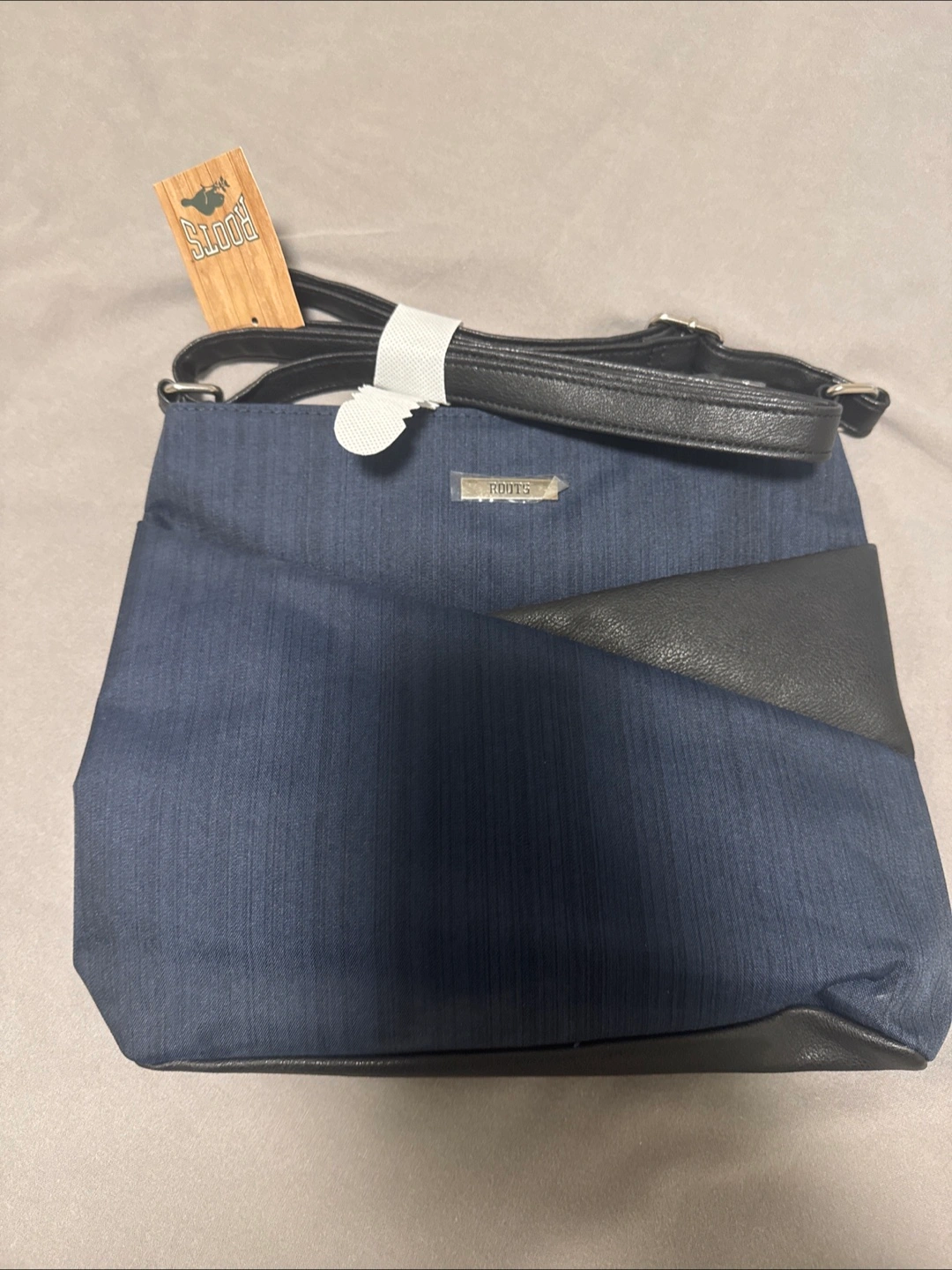 Brand new Roots crossbody bag in a stylish navy blue colour! It still has the original tags attached. The bag features a black strap and a unique design with a black accent panel. Perfect for everyday use!