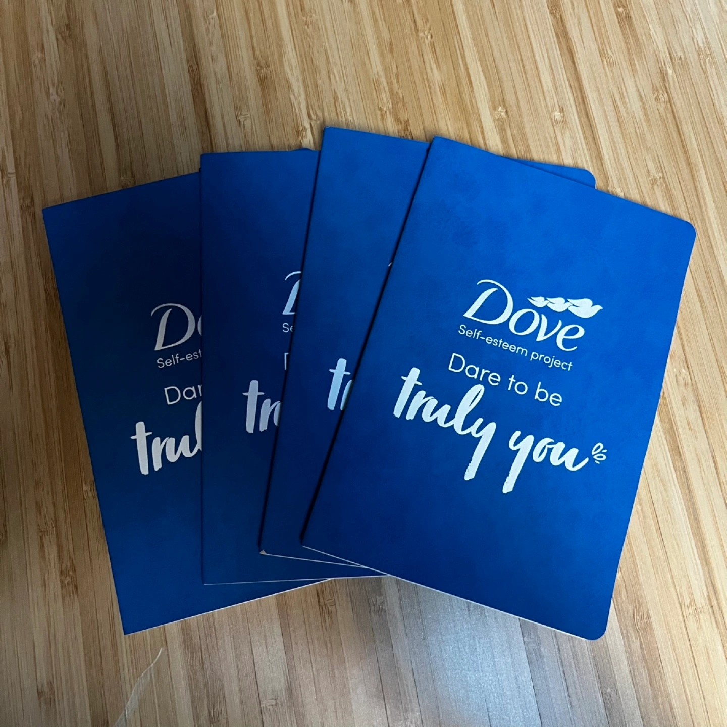 4 Dove Self-Esteem Project notebooks. They are all brand new and unused! Each notebook has lined pages inside. The covers are a nice soft textured and blue in color. Perfect for journaling, doodling, or note-taking for back to school season.