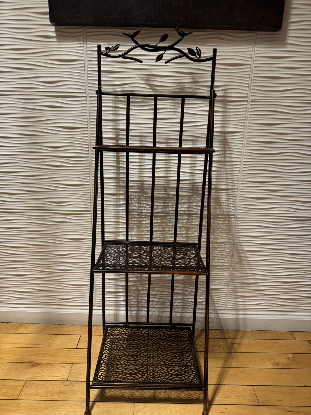 I'm selling a metal decorative leaning ladder shelf. It's perfect for adding a touch of charm to any room. It has three shelves for displaying plants, books, or other decorative items. The shelf is in great condition and ready for a new home!