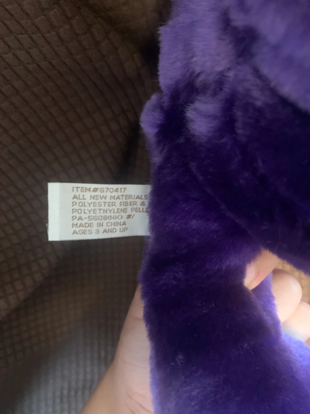 This is a very cute velvete purple teddy bear! Made of polyester fibre and polyethylene pellets, recommended for ages 3 and up. I’m passing it along for free since someone kindly gave it to me for free. Hope it brings joy to the next home!