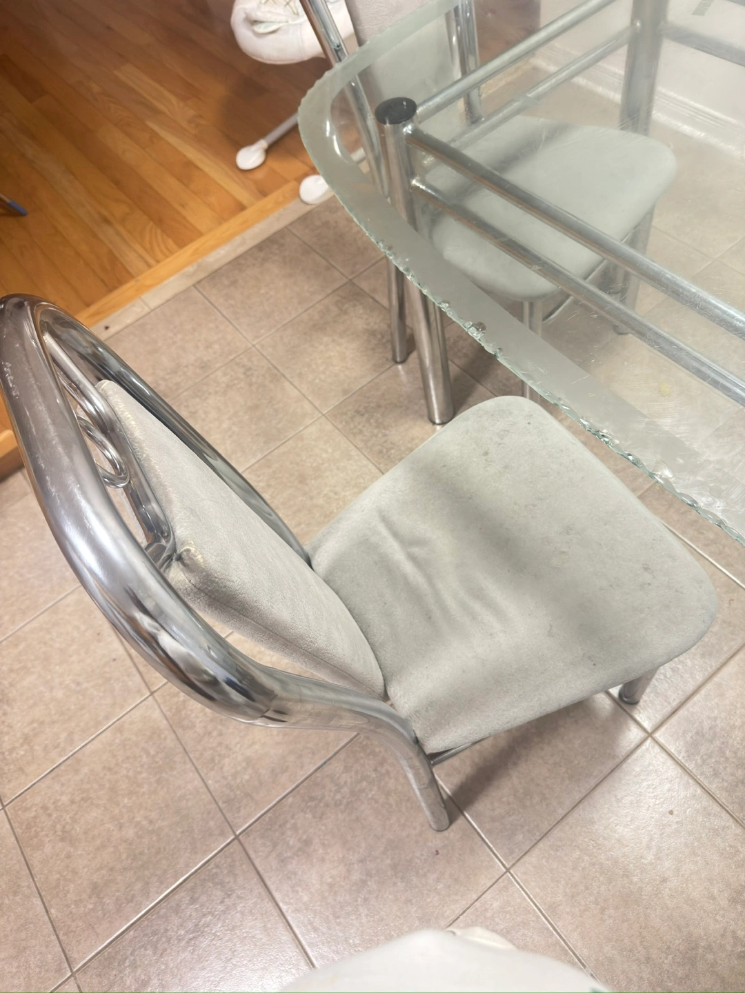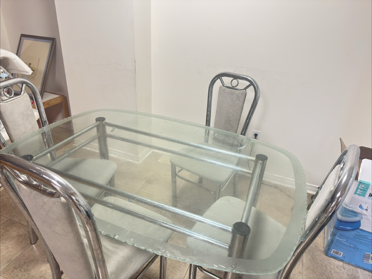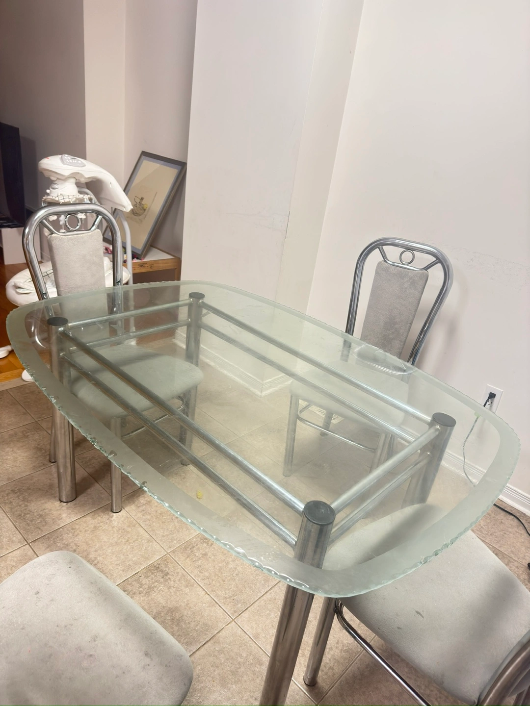 Selling a glass top dining table with four matching chairs. It's a stylish set that would look great in any dining room or kitchen space! The chairs have a comfortable upholstered seat and back. The table and chairs have a sleek, modern design with chrome frames. Perfect for family meals or entertaining guests!