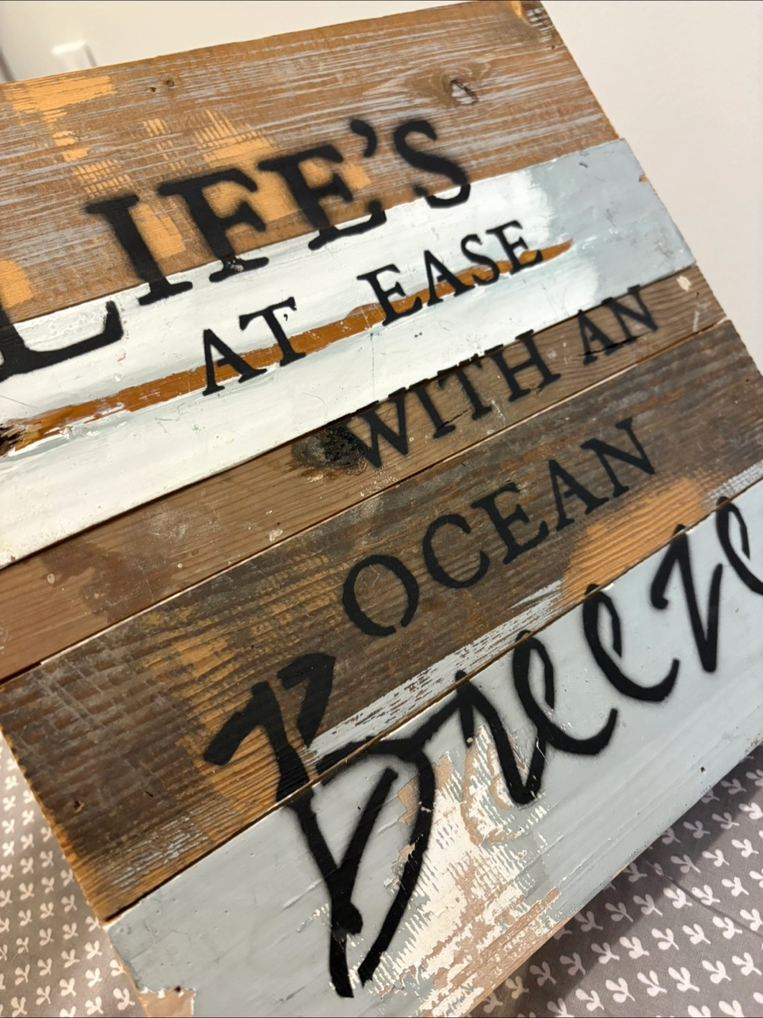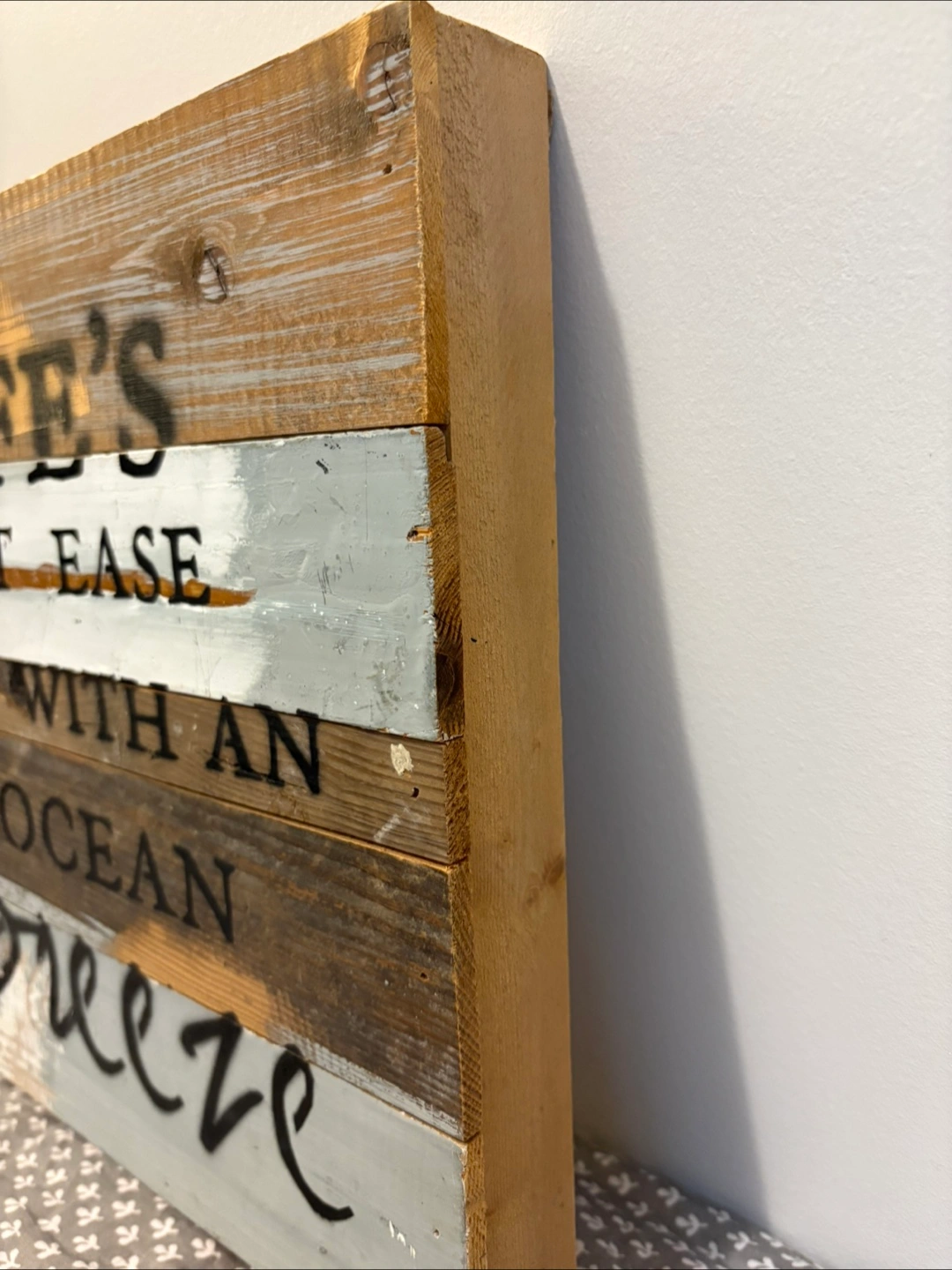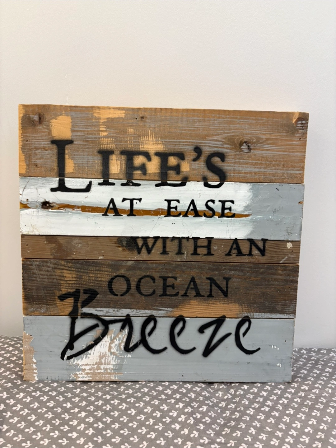 Add a touch of rustic charm to your home with this Sweet Bird & Co. wood wall decor! The sign features the phrase "Life's at ease with an ocean breeze" in black lettering on a weathered wood background. It's perfect for creating a relaxing coastal vibe in any room
