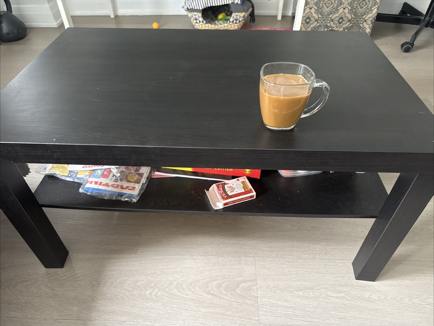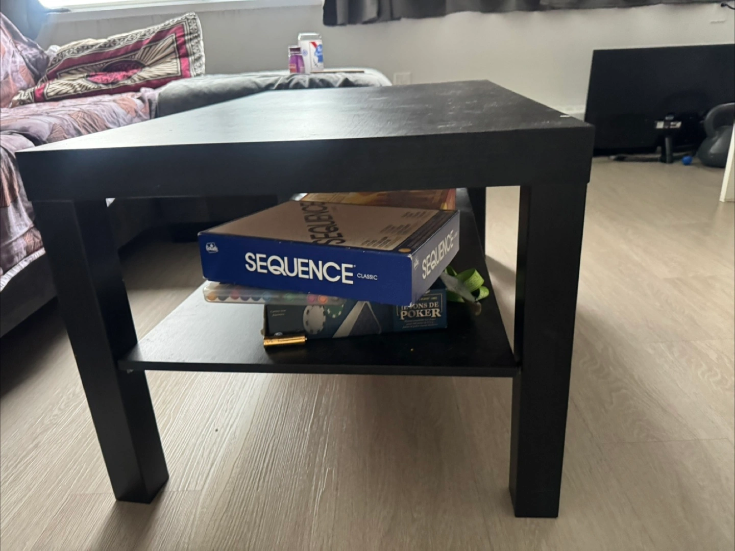 Selling a sturdy black coffee table. It's great for any living room setup and has a convenient shelf underneath for storage. It's in good condition and ready for any living room or any other room for decor!
