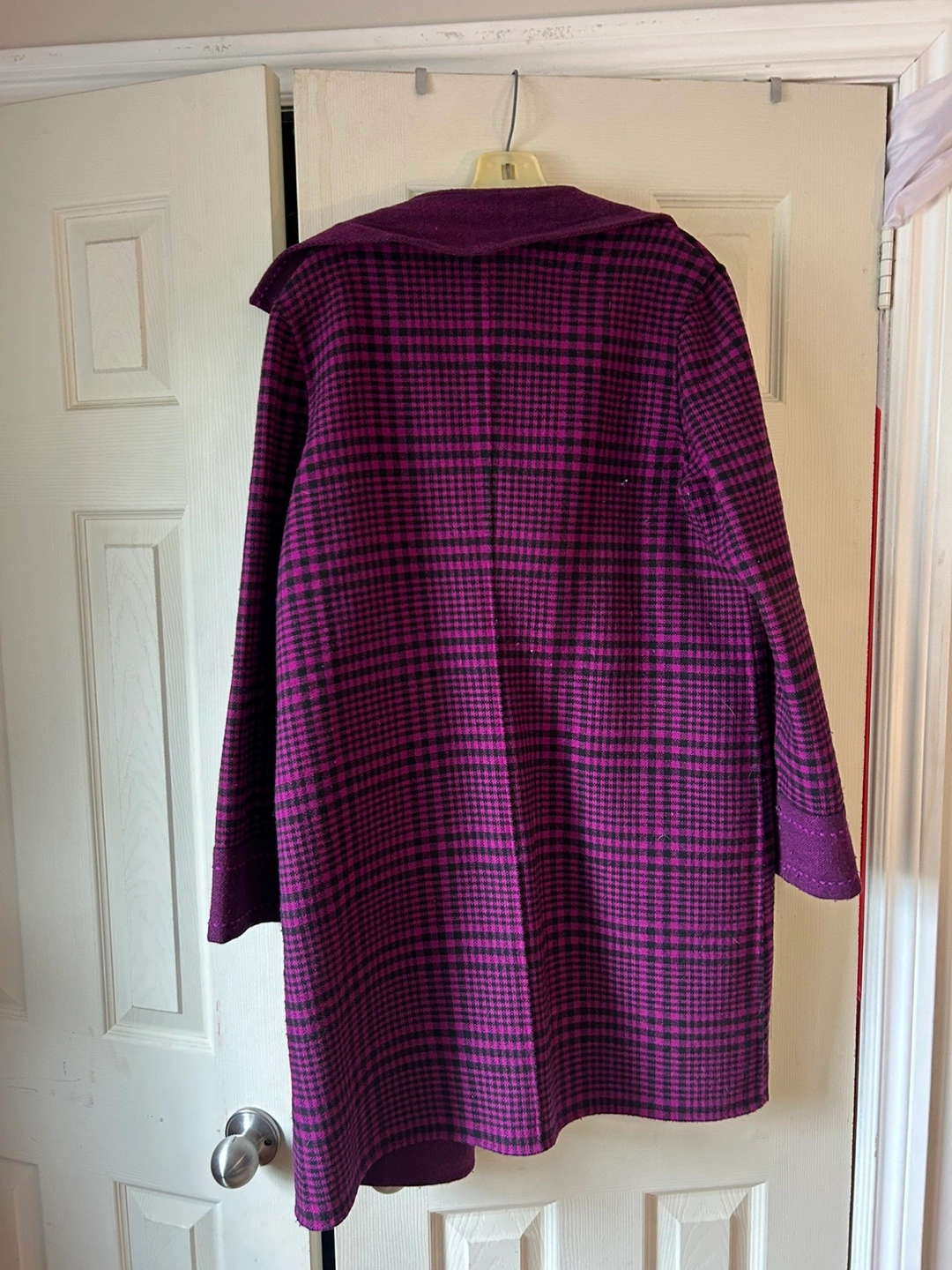 Here's a lovely purple and black plaid coat! It features a wool blend material, perfect for staying warm during the cooler months. This stylish coat is sure to add a pop of colour to your wardrobe!