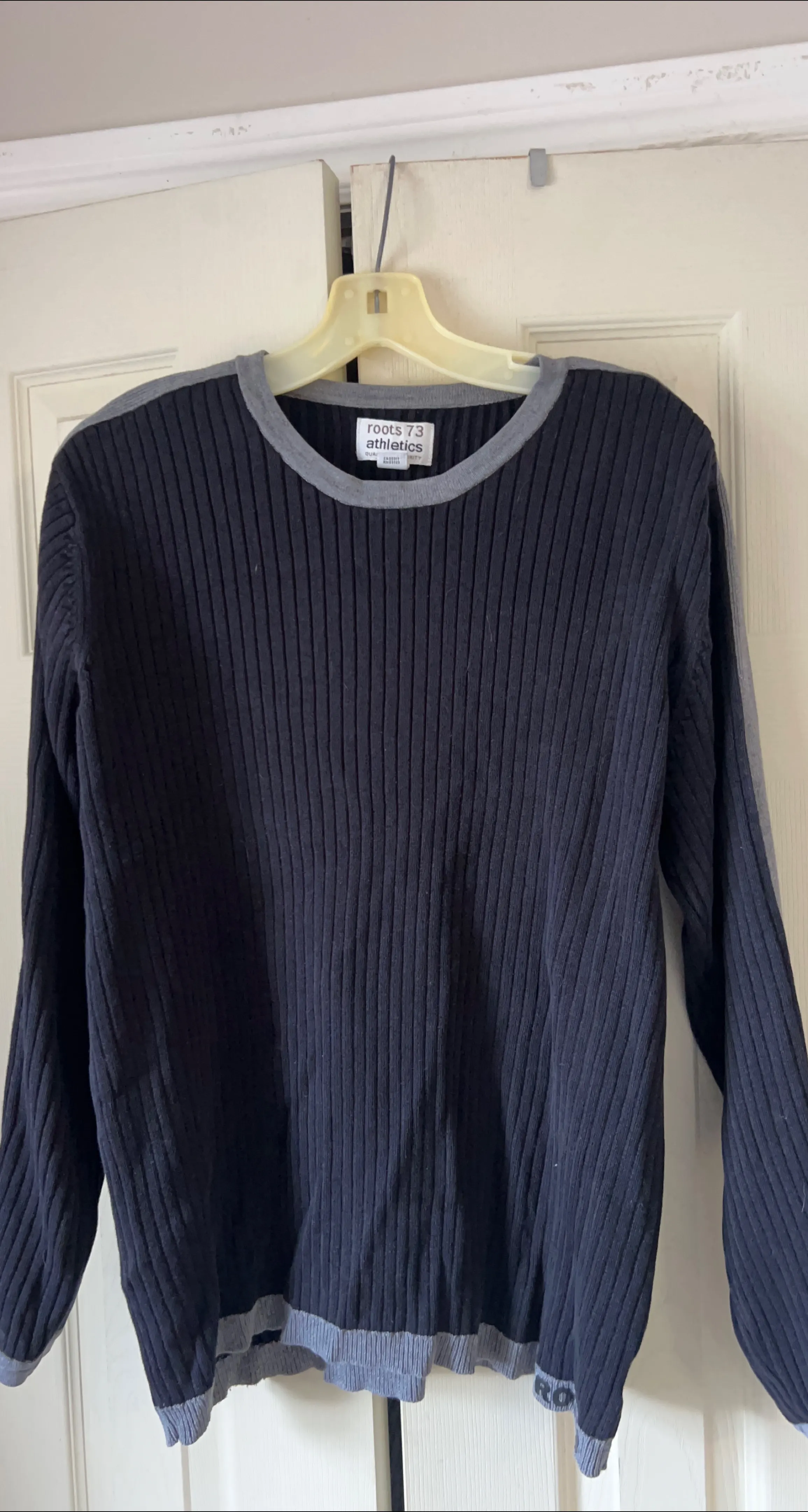 Here's a Roots 73 Athletics sweater in black! It has a ribbed texture and grey detailing around the collar, cuffs, and hem. It's in great condition and ready for a new home