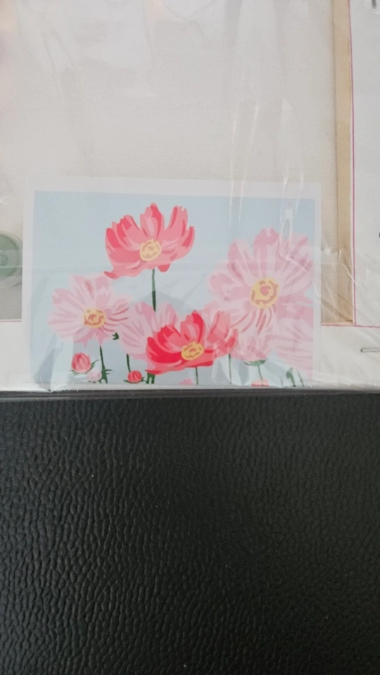 Another paint by number kit! This time, the canvas is already on a wooden frame. Finished product is the lovely picture of pink flowers