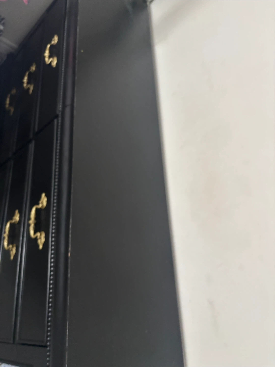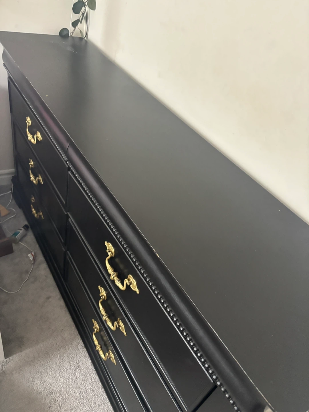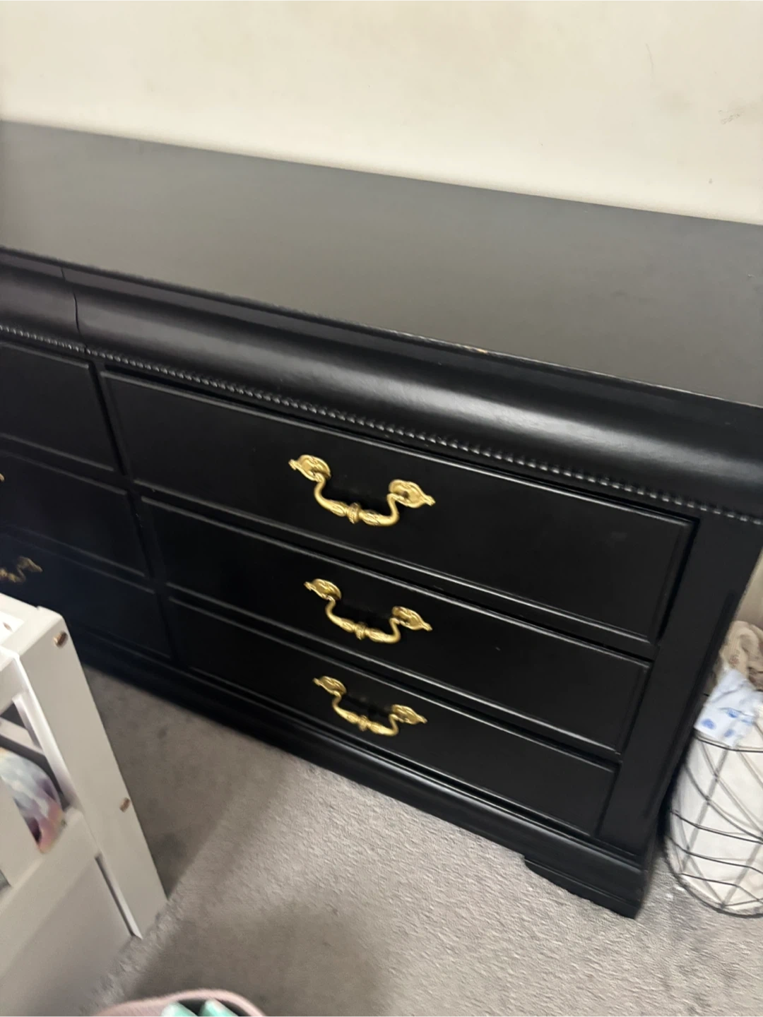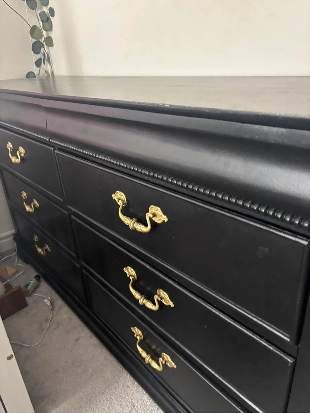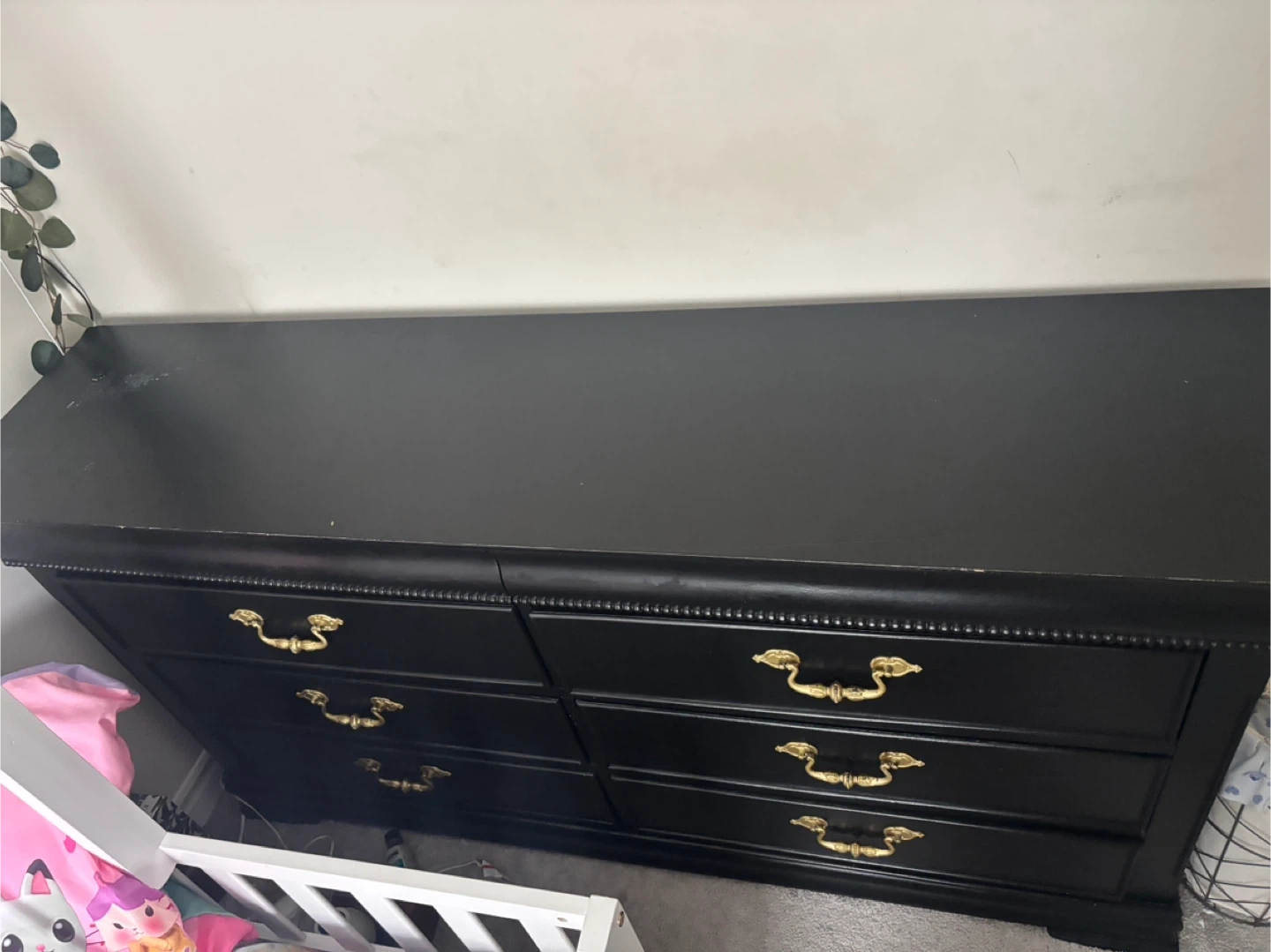 202Selling a stylish black dresser! It features elegant gold handles, adding a touch of sophistication to any room. It's in great condition and ready for a new home. 6 drawer dresser .