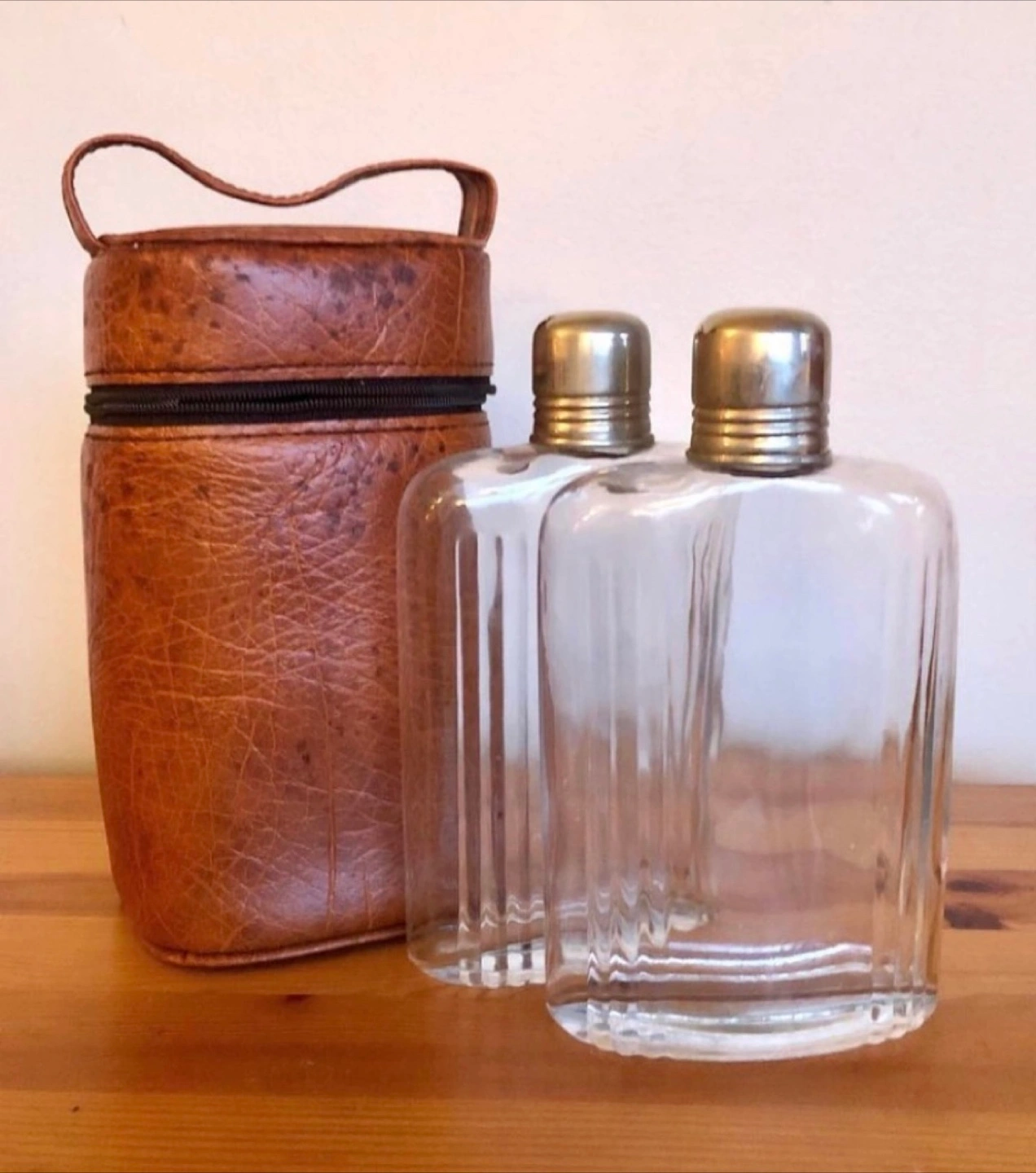 Selling a vintage twin flask set! It comes with two 12 oz wine flasks and a jigger, all neatly stored in a stylish leather case. A unique addition to any collection or a great gift for the vintage enthusiast