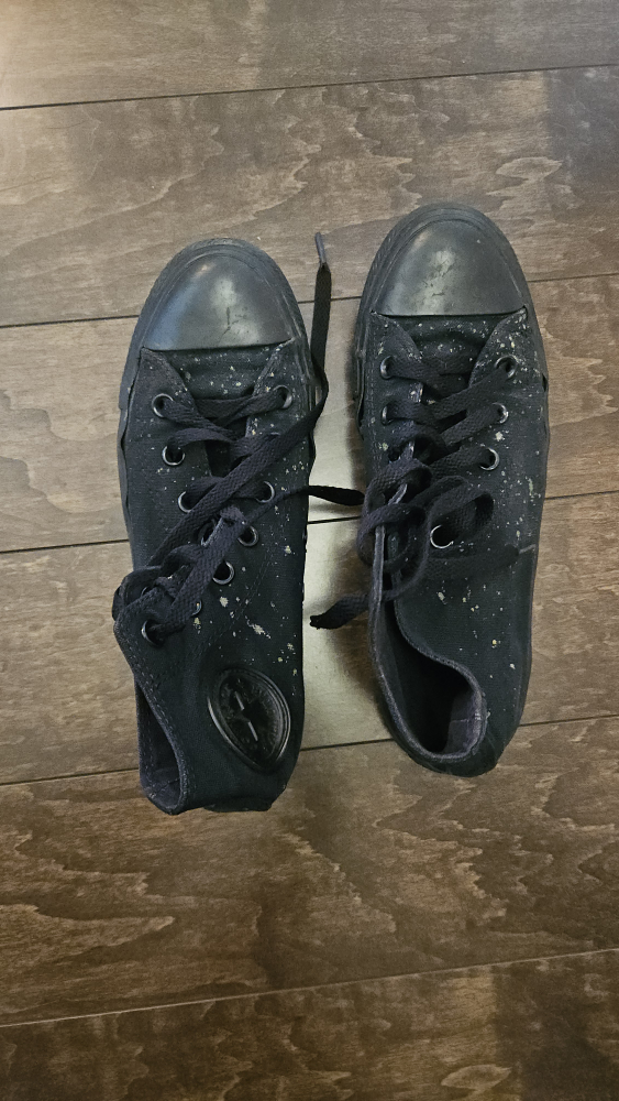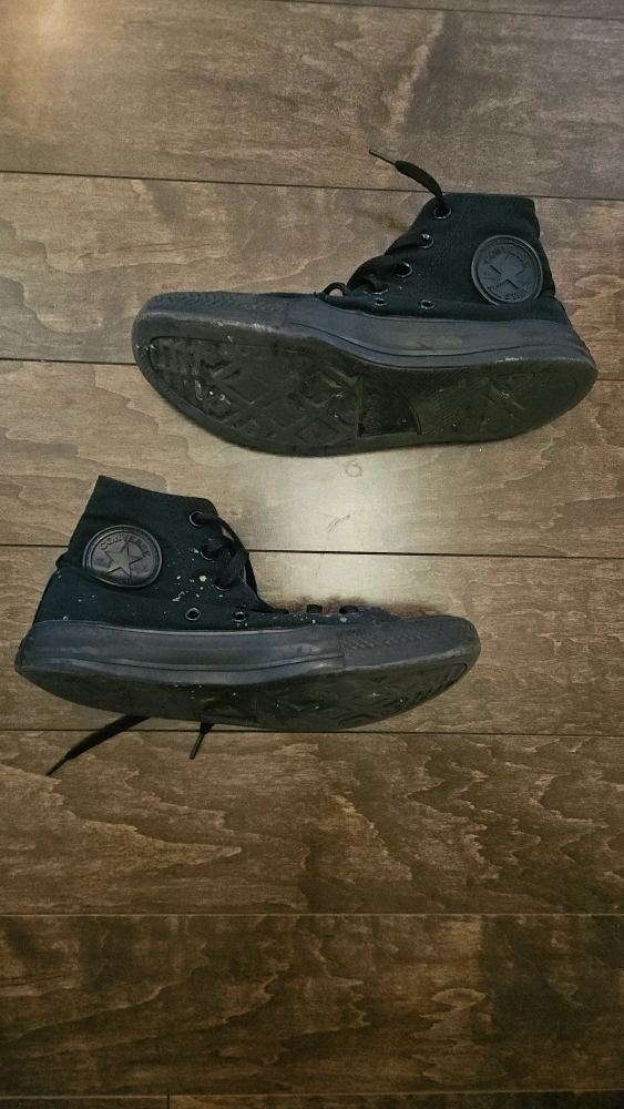 Converse high-top shoes in size 5 1/2. Color is actually a really dark green that is closer to black. It has some bleach stains 😔