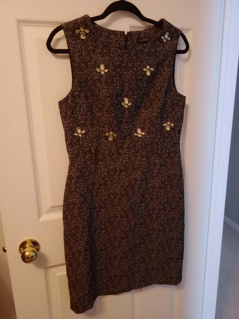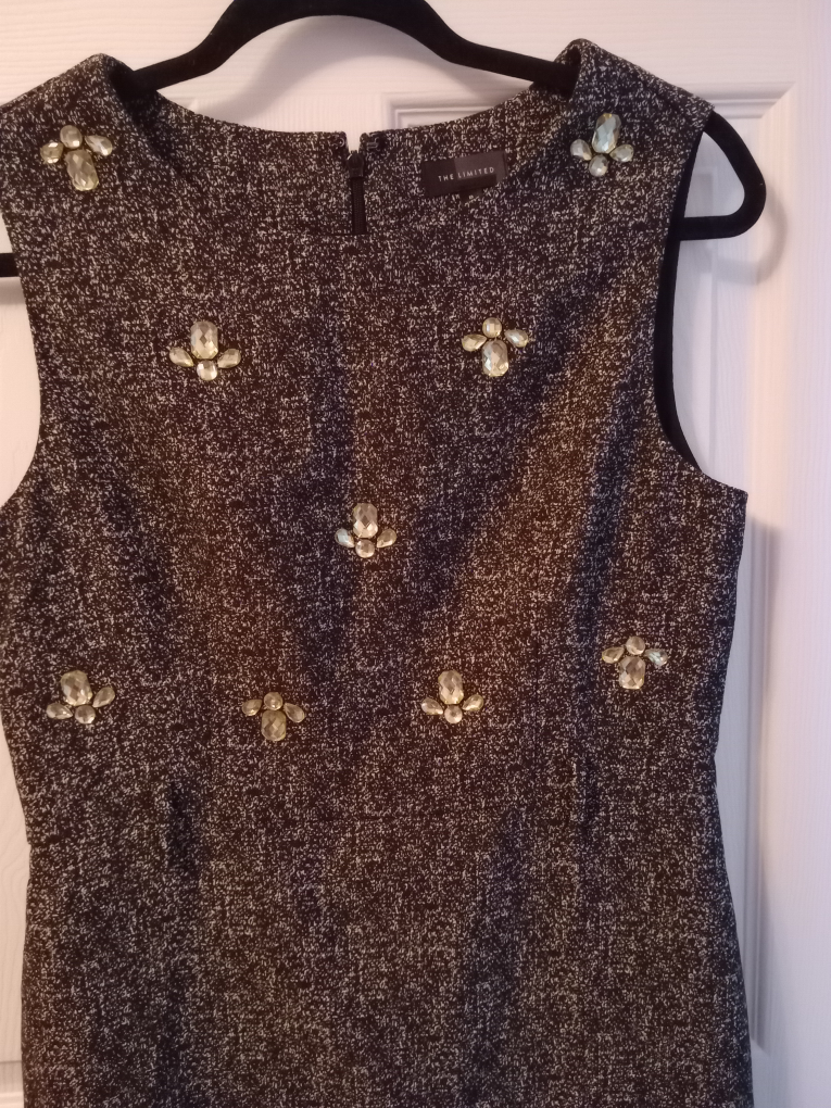 This is a elegant The Limited dress, size 8. The tweed-like fabric and jeweled embellishments make it perfect for a party or a professional event. The dress is in perfect condition and ready for a new home.