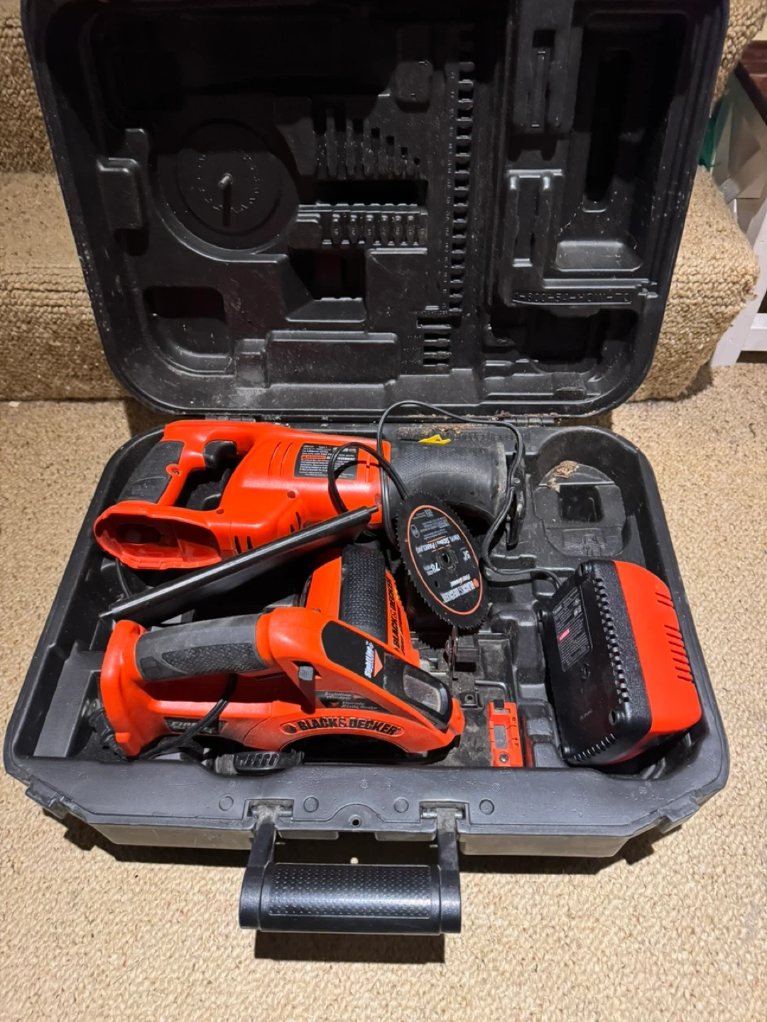 Selling a Black+Decker power tool set that comes with its original case! It includes a drill, saw, and charger. Great for someone looking to start their tool collection or needs a reliable set for home projects