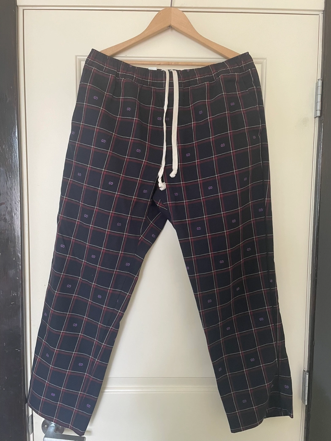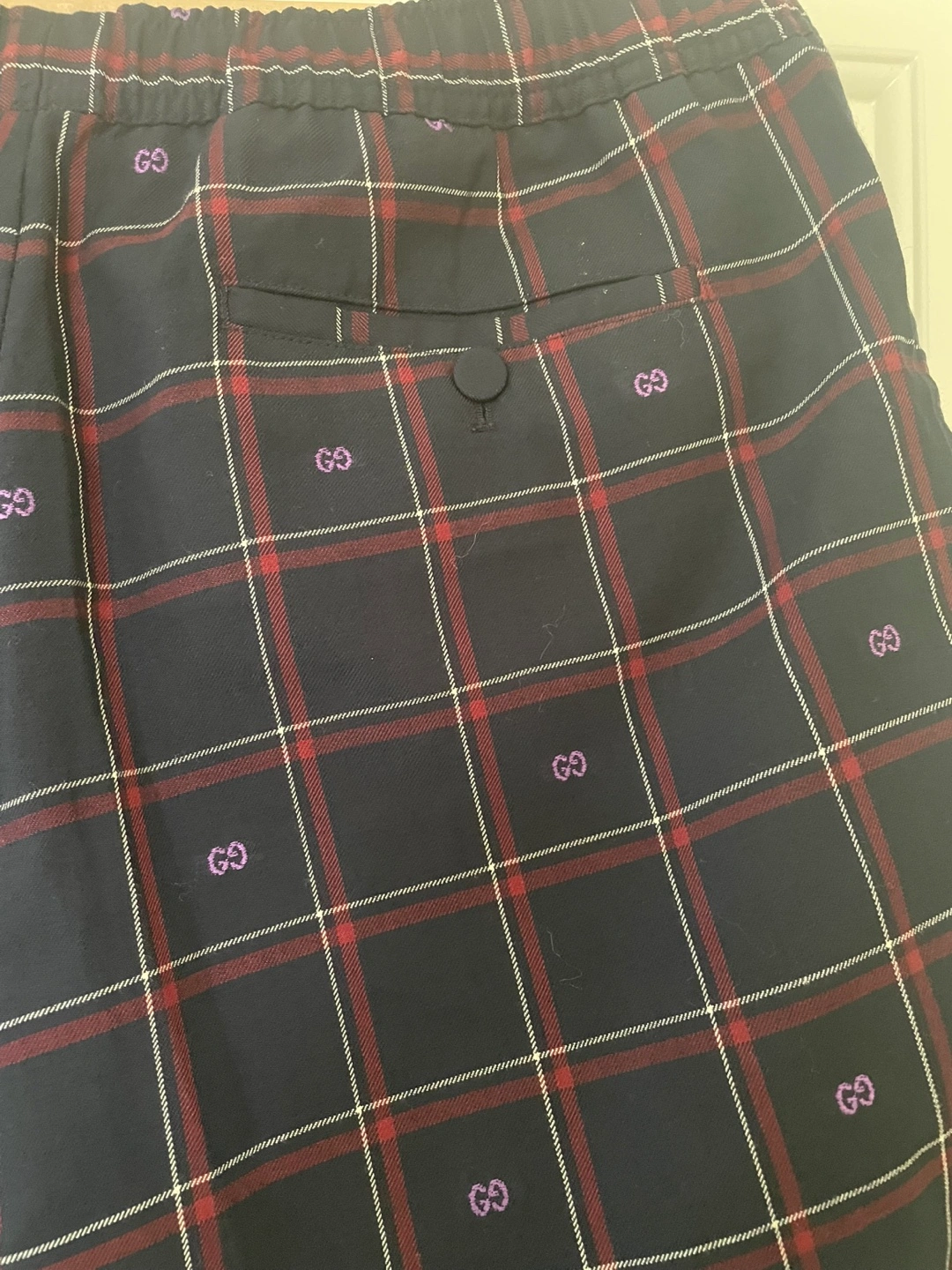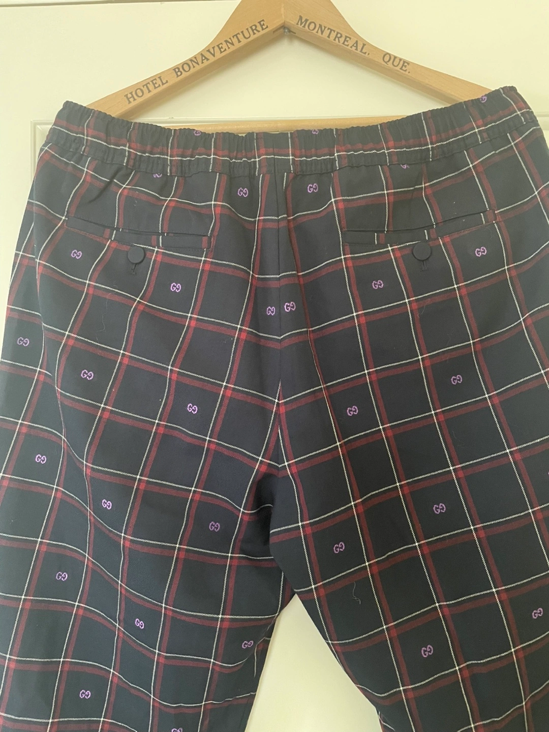 These are super comfy lounge pants from Gucci! They feature a stylish plaid pattern with the Gucci logo subtly incorporated throughout. Perfect for relaxing at home or adding a touch of luxury to your casual wear