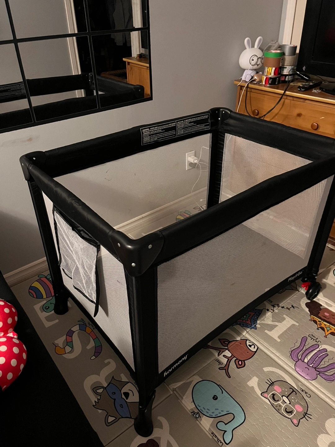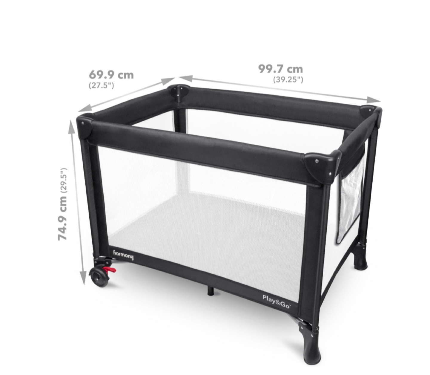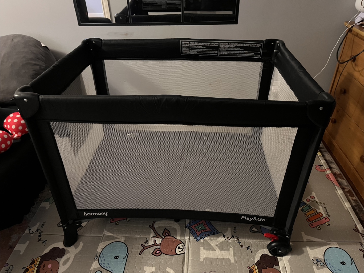 Harmony Play & Go Elite Play Yard in black! It features a zip-on bassinet and an easy-reach storage pouch. It also has lockable wheels for easy movement and stability. Originally bought for $119.99 + tax