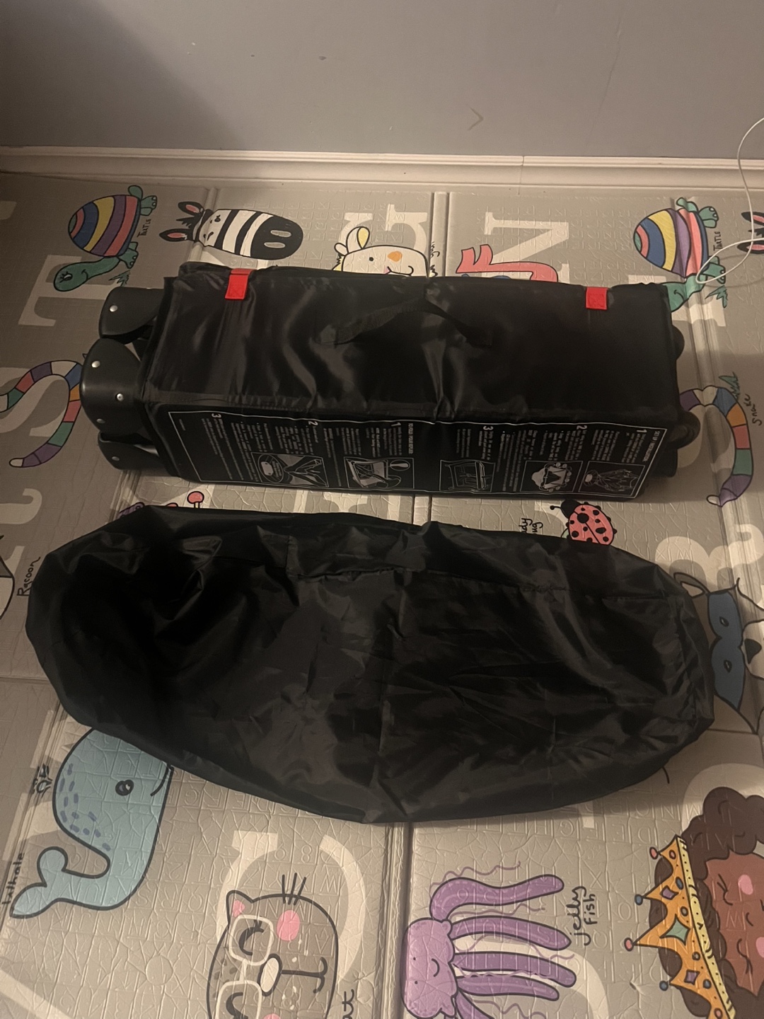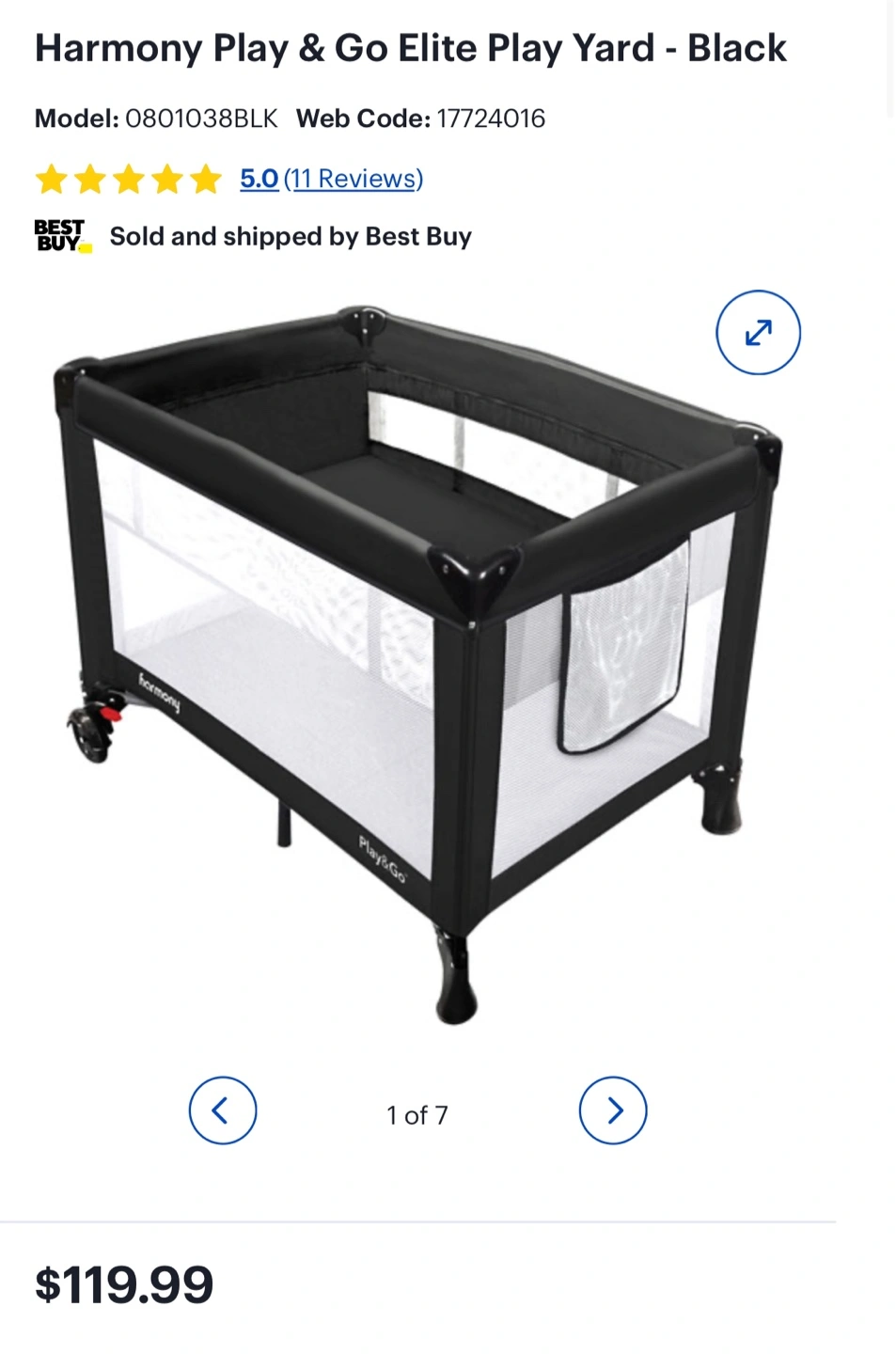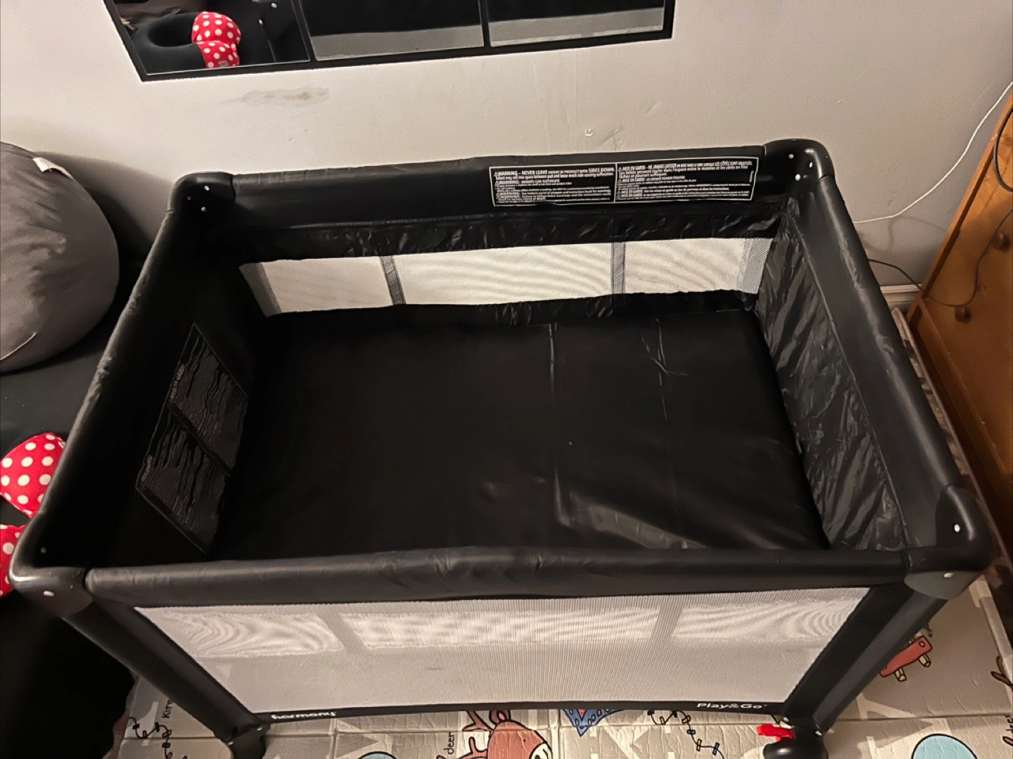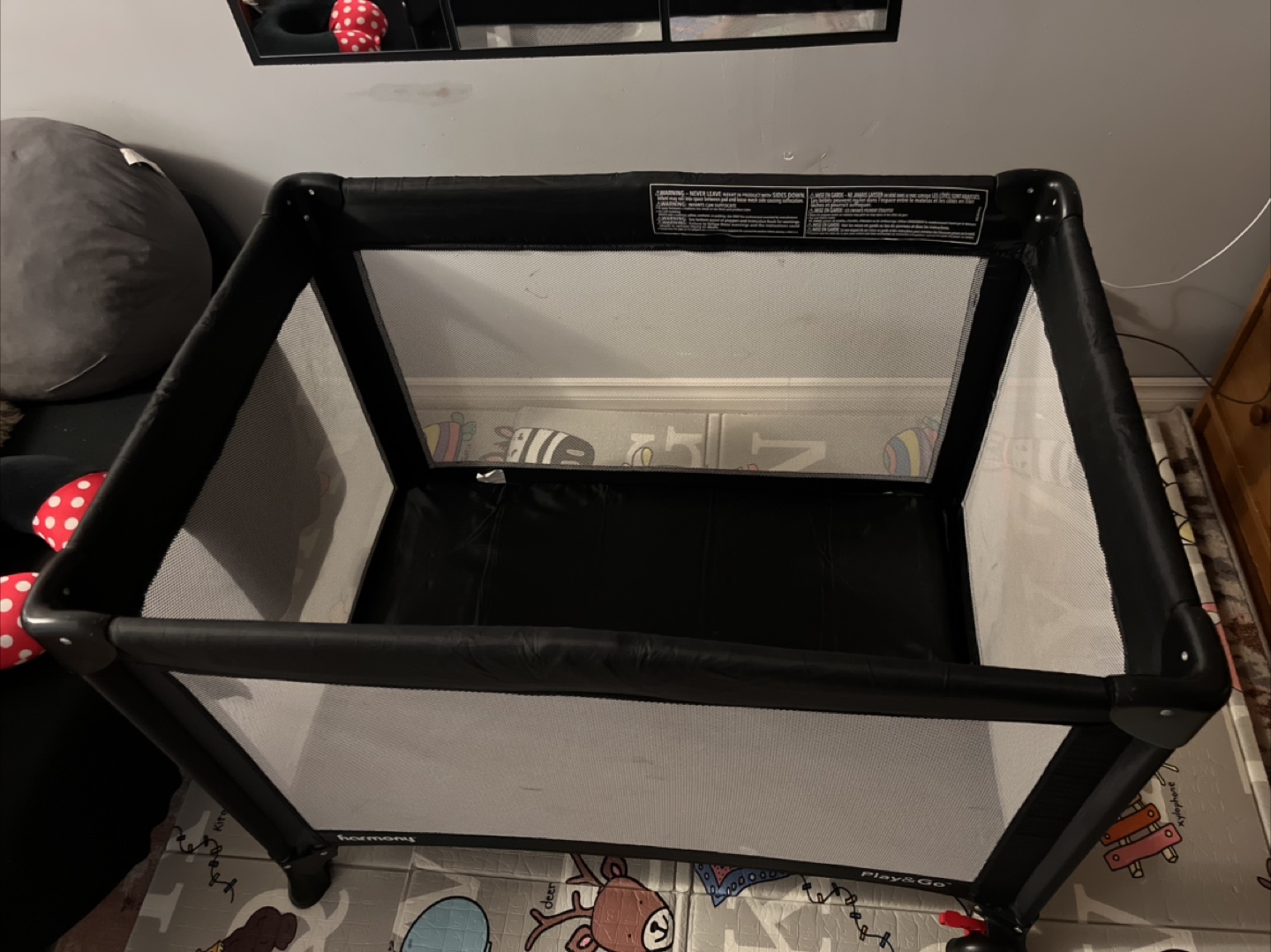 Harmony Play & Go Elite Play Yard in black! It features a zip-on bassinet and an easy-reach storage pouch. It also has lockable wheels for easy movement and stability. Originally bought for $119.99 + tax