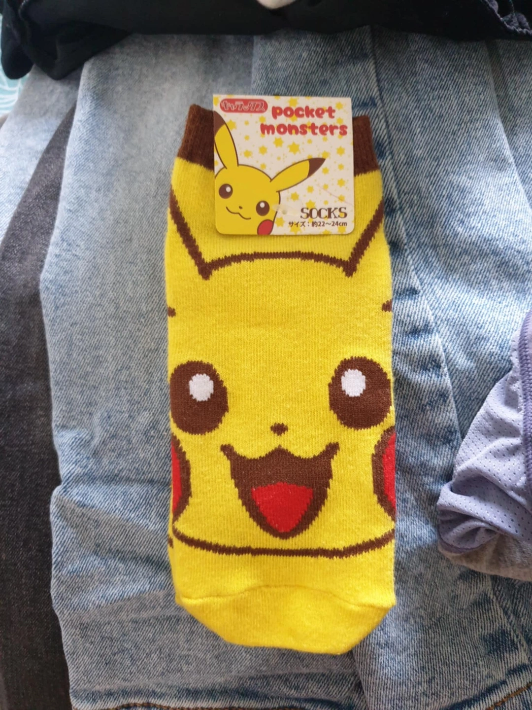 Here are some adorable Pikachu socks! They are yellow and feature Pikachu's face. The size is approximately 22-24 cm. Got in Japan Meet at Sheppard, Bayview, or Bloor/Yonge station or some surrounding areas.