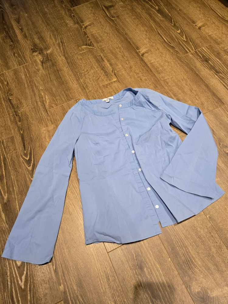 Here's a light blue long-sleeve blouse! It features a button-down front and a unique sleeve design. Perfect for adding a pop of colour to your wardrobe!