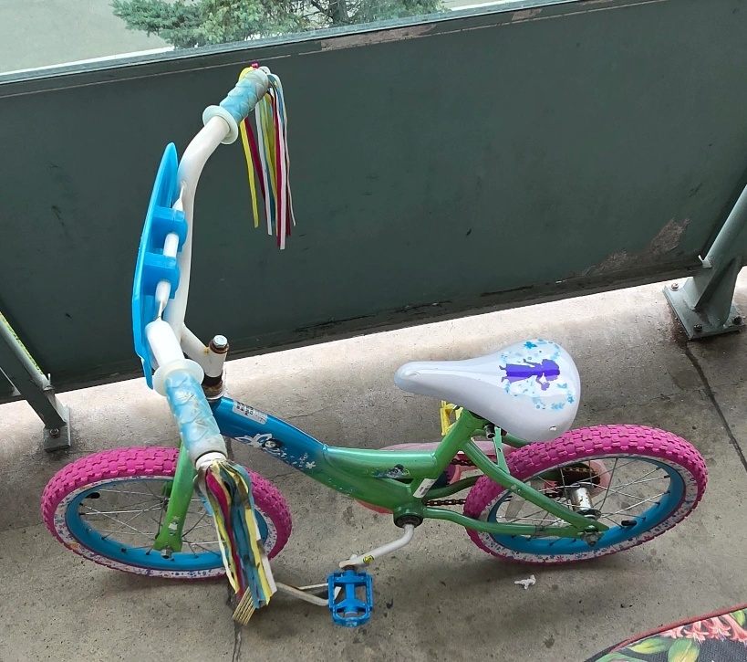 Streamers: Multi-colored ribbon streamers . Grips: Comfortable grips have fun flower pattern. Seat: Beautifully decorated, padded seat with a quick-release lever for easy height adjustment. Training Wheels: Wide training wheels provide stability while riding and they are easily removed. Tires: 16" x 1.95" bright pink tires. Rims: Durable steel rims in yellow. Pedals: Junior size pedals with reflectors