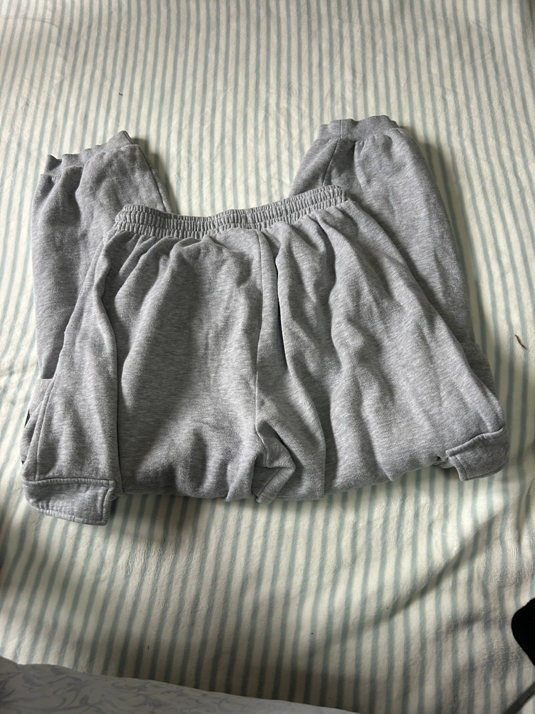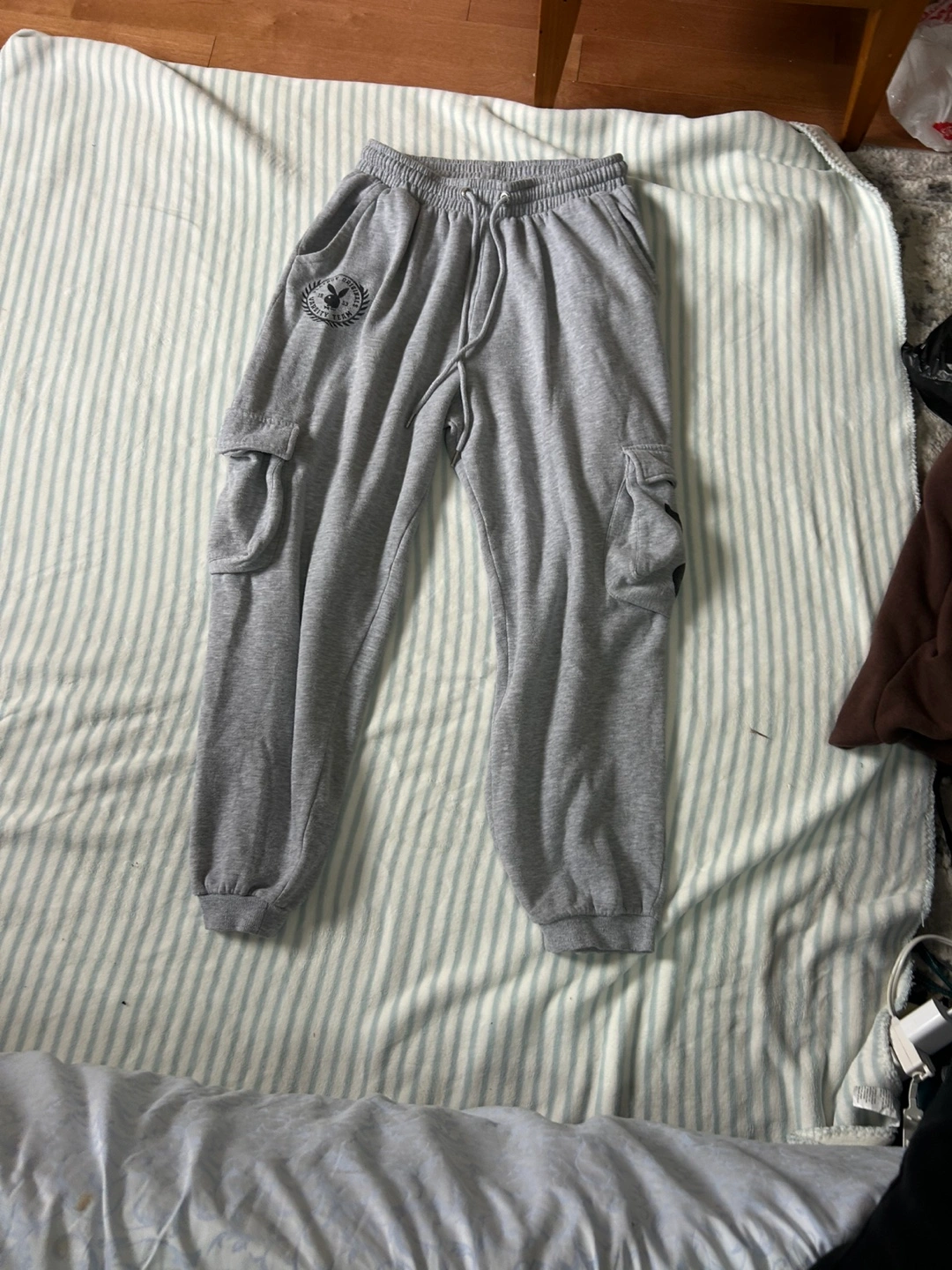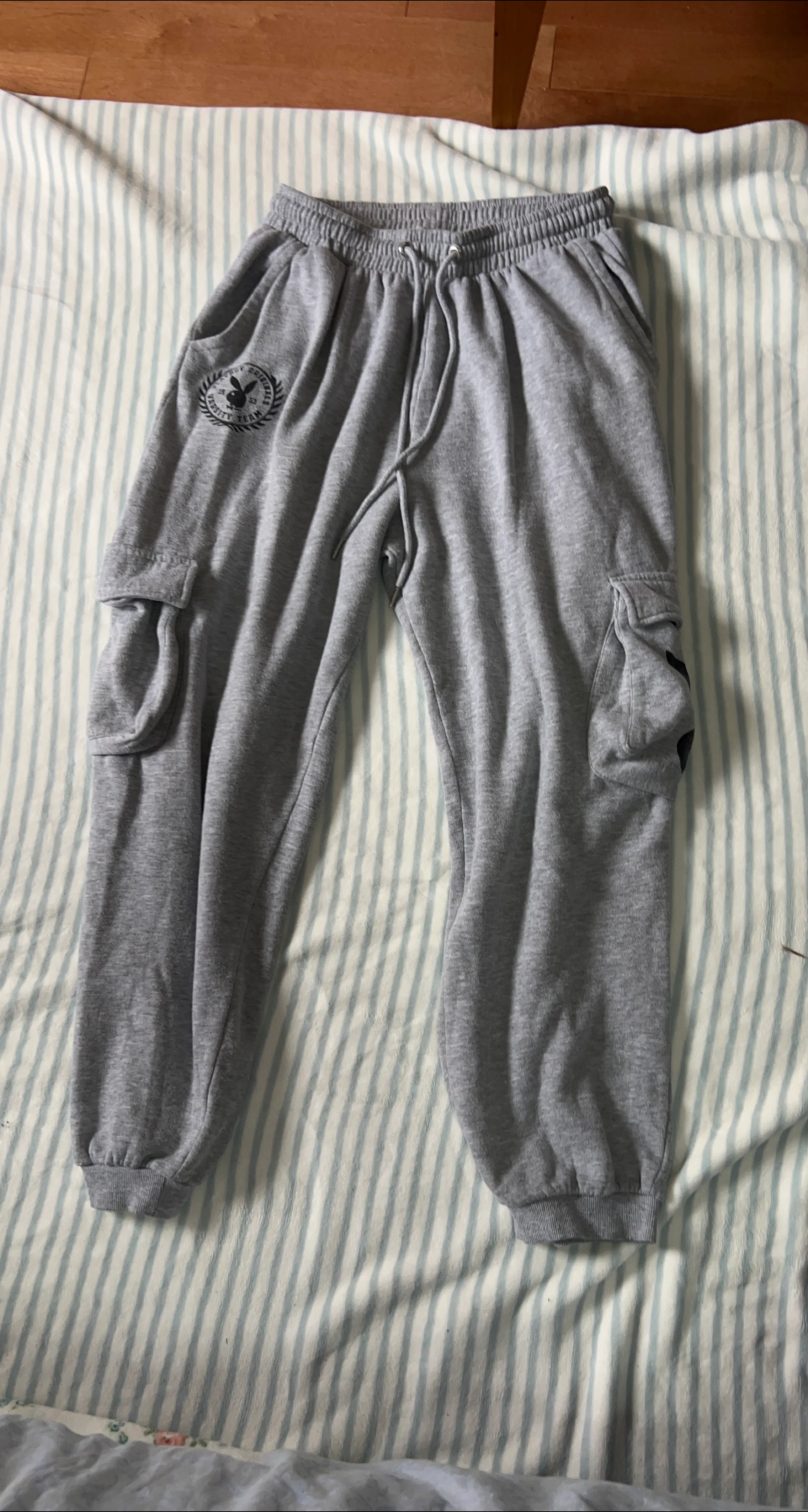 These are a pair of grey cargo sweatpants from Playboy. They are in great condition and super comfy for lounging around the house or running errands!