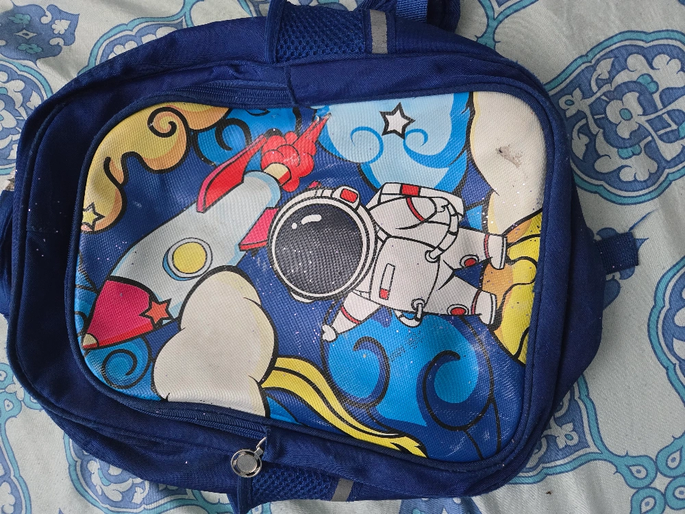 Here's a cute little blue backpack for kids! It features a fun design with an astronaut and a rocket ship. Perfect for carrying toys or snacks on little adventures