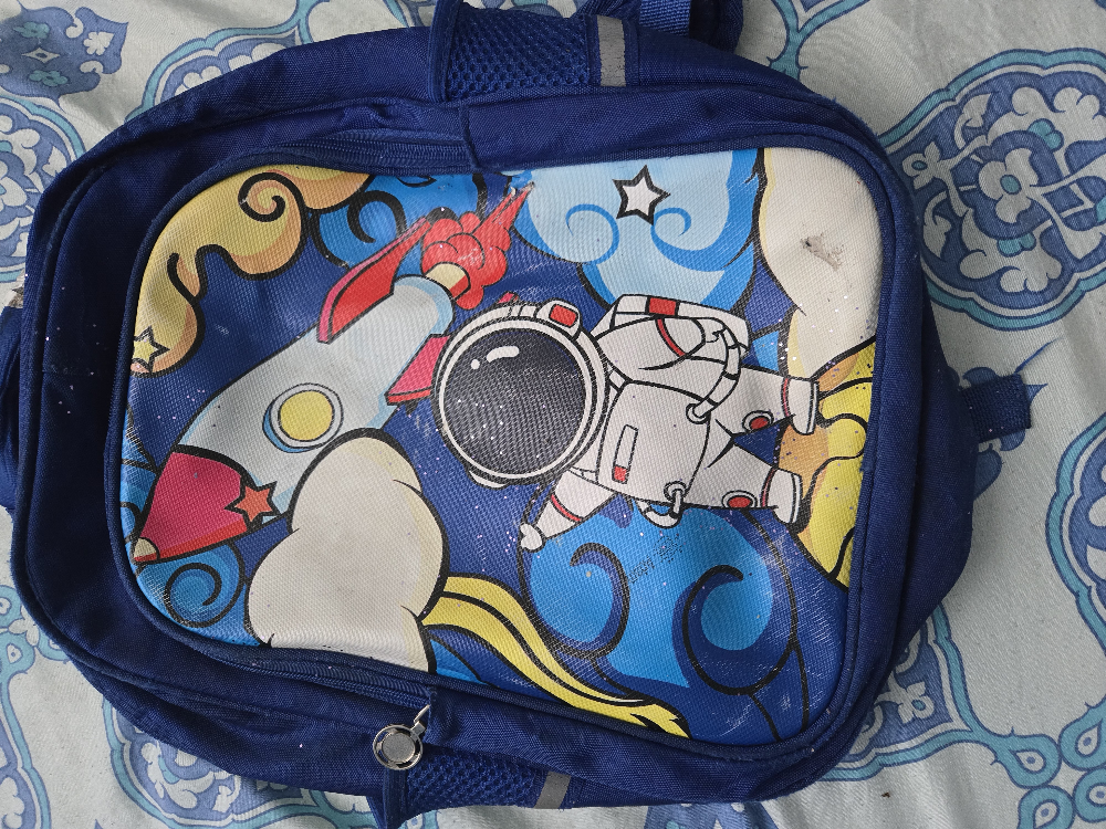 Here's a cute little blue backpack for kids! It features a fun design with an astronaut and a rocket ship. Perfect for carrying toys or snacks on little adventures