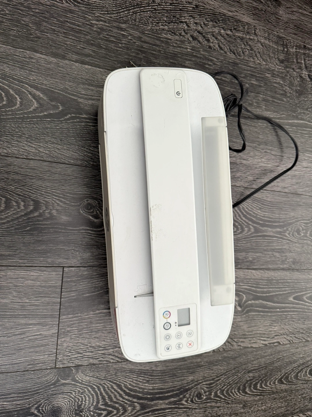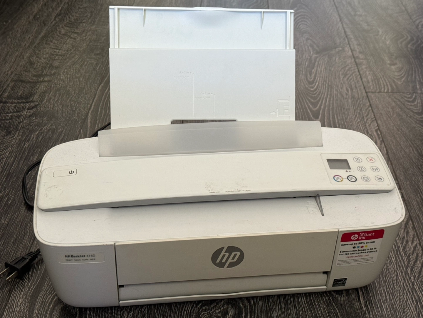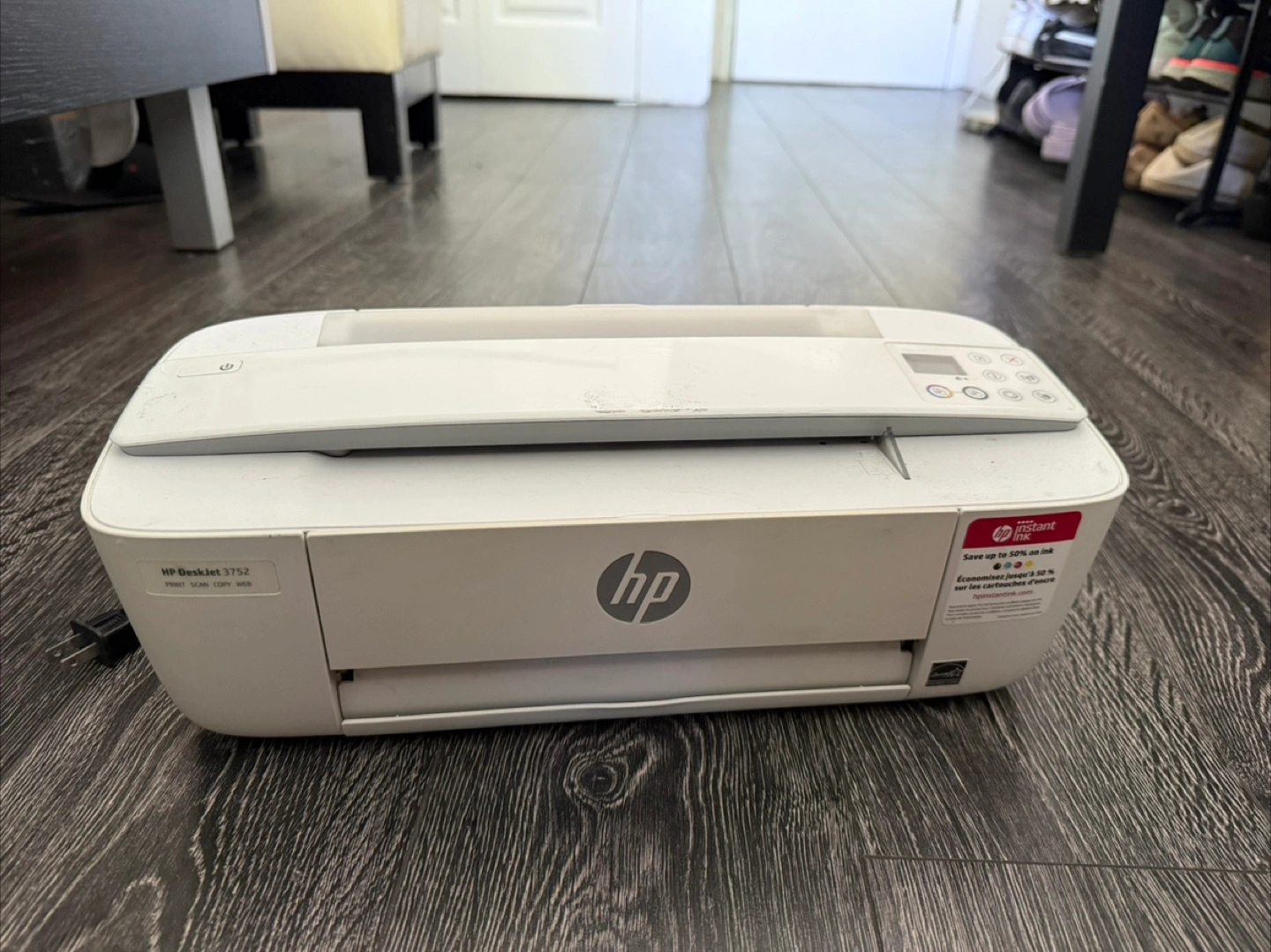 Selling a used HP DeskJet 3752 printer in white. It's a print, scan, copy, web printer. It does show signs of use, but it is still functional. Perfect for home or small office use!