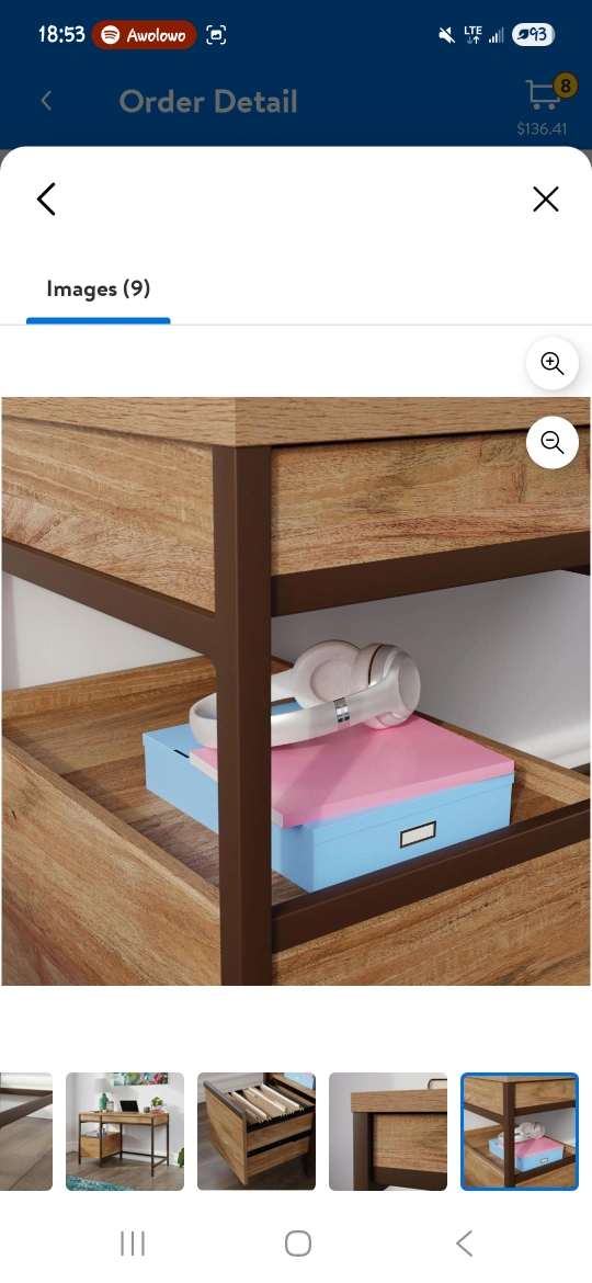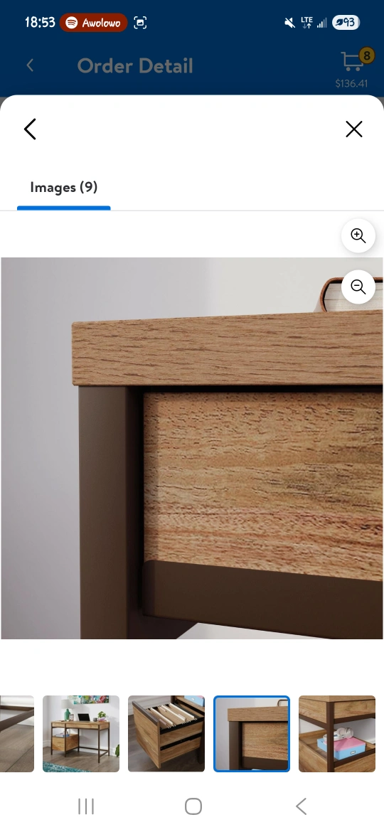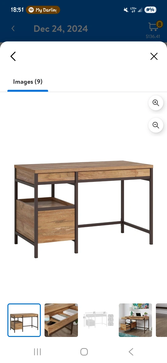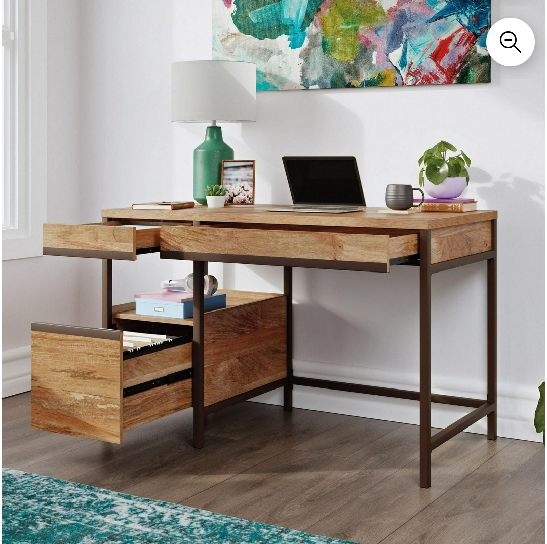 Looking to sell this stylish writing desk! It features a beautiful combination of brown wood and a sturdy metal frame. Great for a home office or study space! It has a drawer and storage space below.