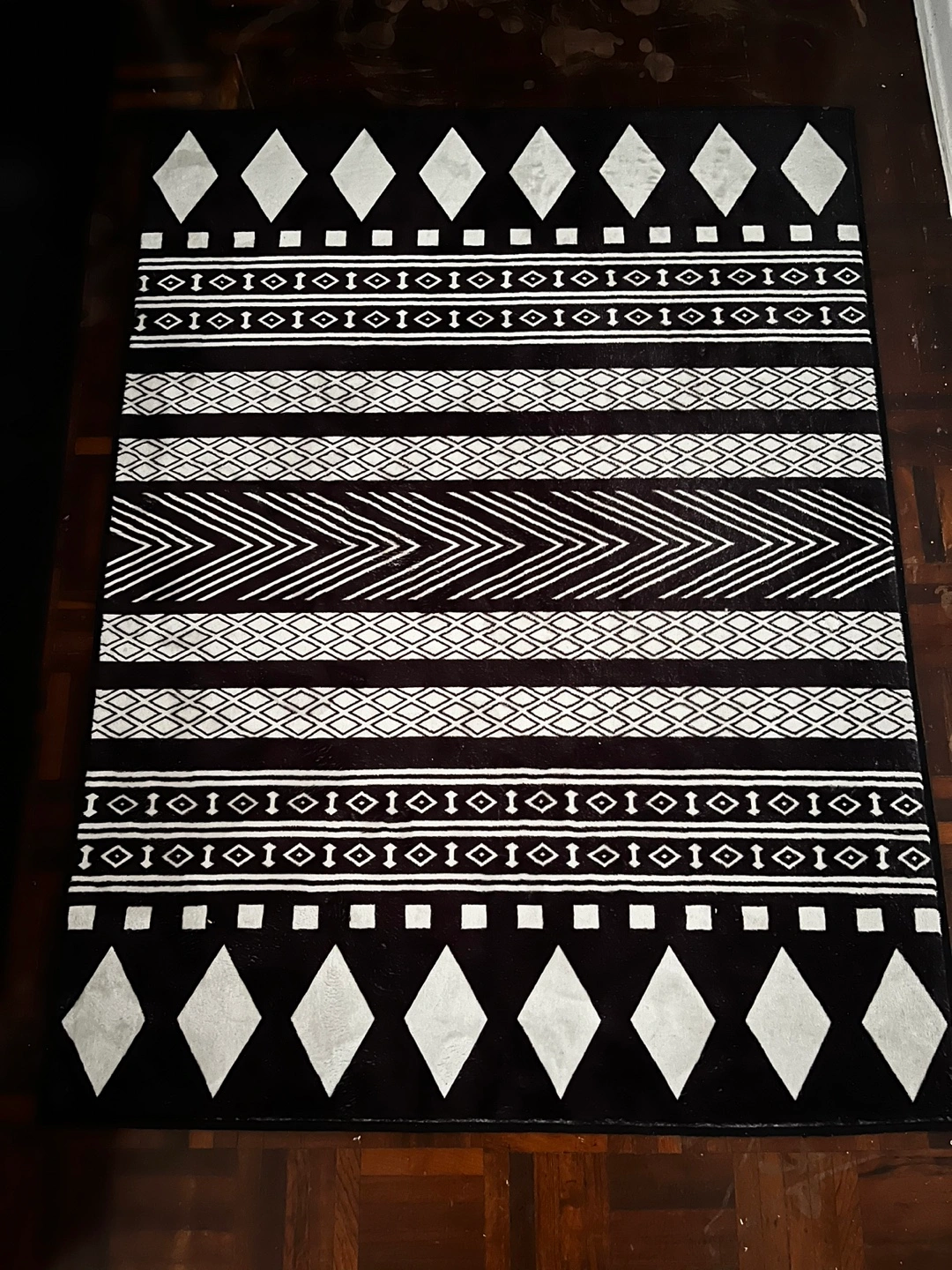 Selling a 4x3ft stylish black and white patterned area rug. It's in great condition and would add a touch of modern design to any room. The rug features a striking geometric pattern that's sure to catch the eye. Perfect for living rooms, bedrooms, or any space needing a bit of flair
