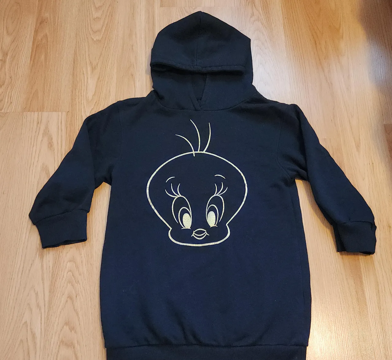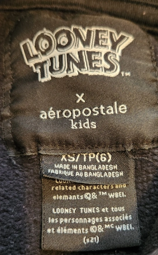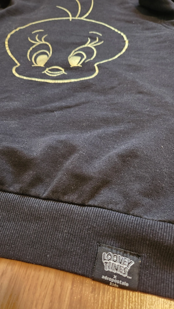 Check out this adorable Looney Tunes x Aeropostale Kids hoodie! It's a size XS/TP(6) but it's long and features a cute Tweety Bird design in gold. Perfect for keeping your little one cozy and stylish!