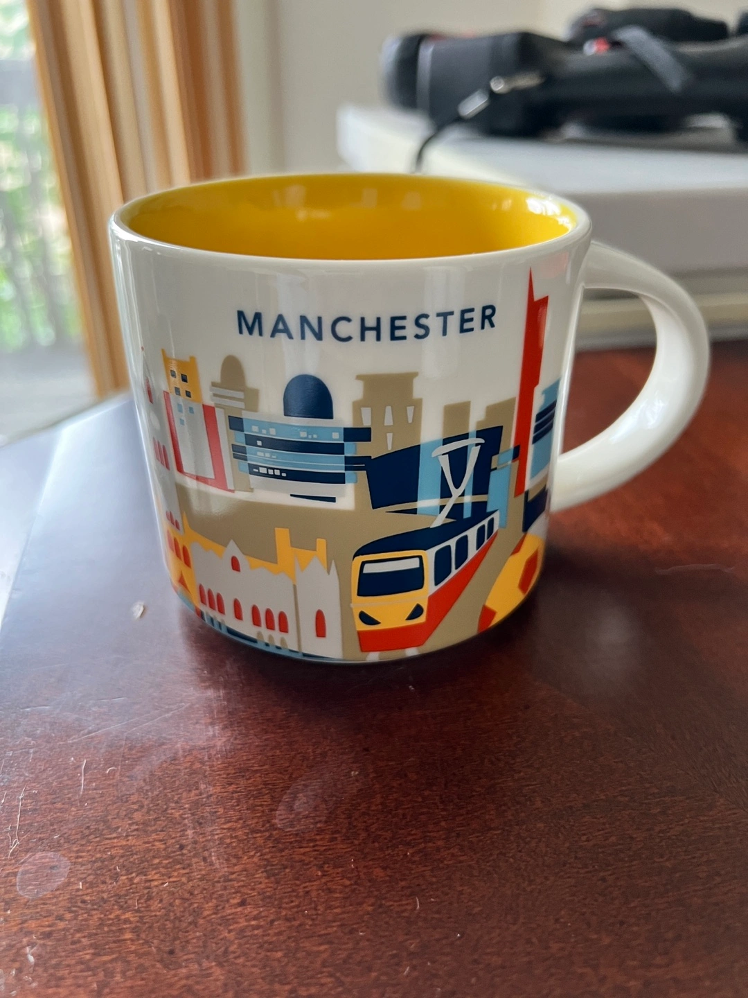 Selling a Starbucks mug featuring a Manchester design. It has a yellow interior and a white exterior with colourful illustrations of the city. Perfect for coffee or tea!