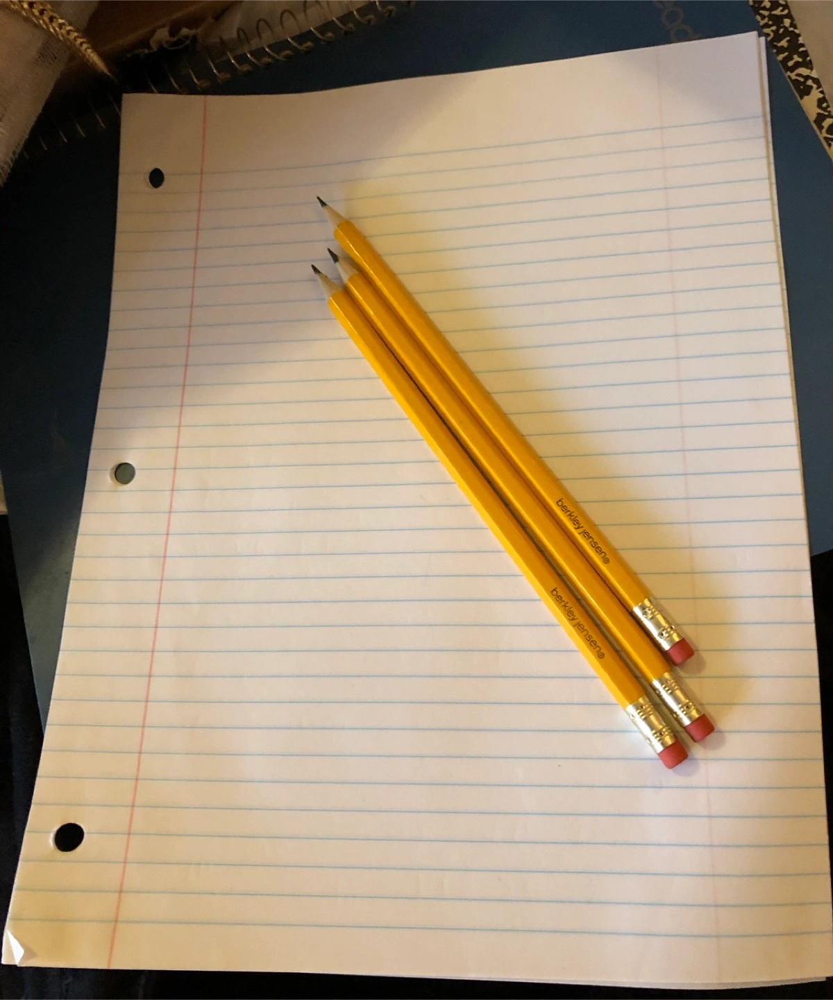 This is a set of 3 Berkley Jensen pencils. They're the standard yellow color and appear to be in great shape! Alongside a set of about 20 sheets of loose leaf paper for school!
