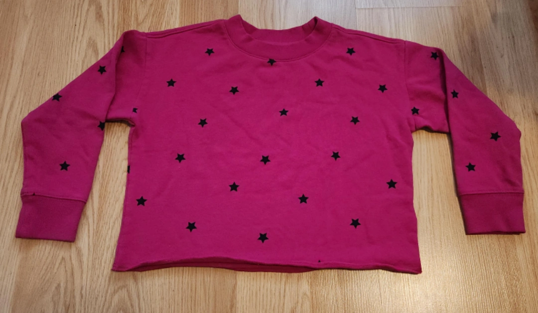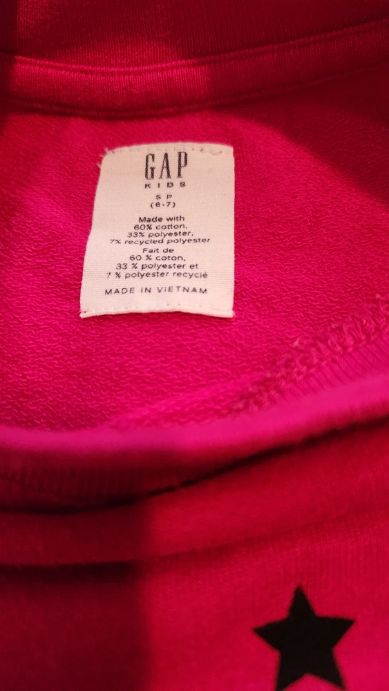 Here's a cute GAP Kids sweatshirt up for grabs! It's a vibrant pink colour with a fun star pattern all over. The size is S (6-7), and it's made of a comfy blend of 60% cotton, perfect for keeping your little one cozy.