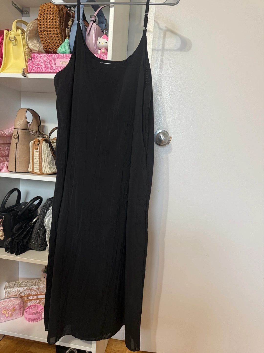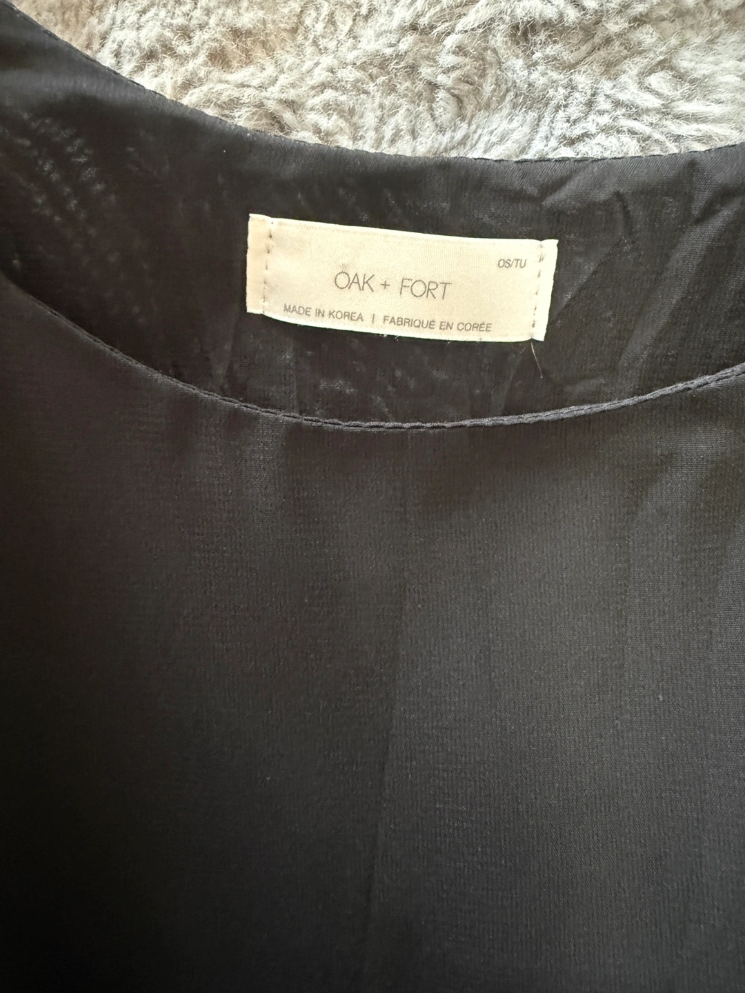 Selling a gently used black dress from OAK + FORT. It's a versatile piece that can be dressed up or down. The size is OS/TU (One Size/Taille Unique). Made in Korea. Perfect for any occasion!